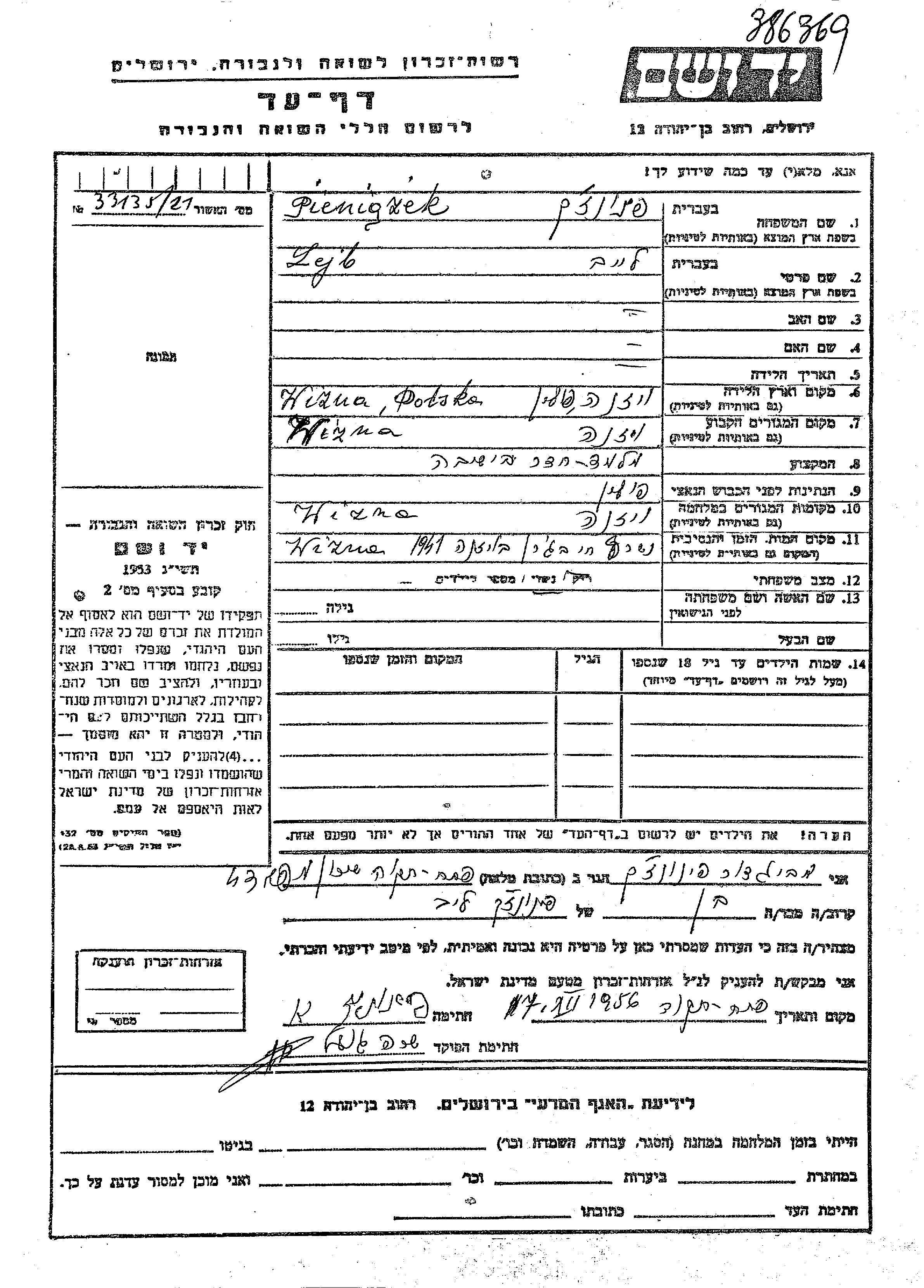 Pieniazek Lejb Wizna, Pologne Feuille de témoignage