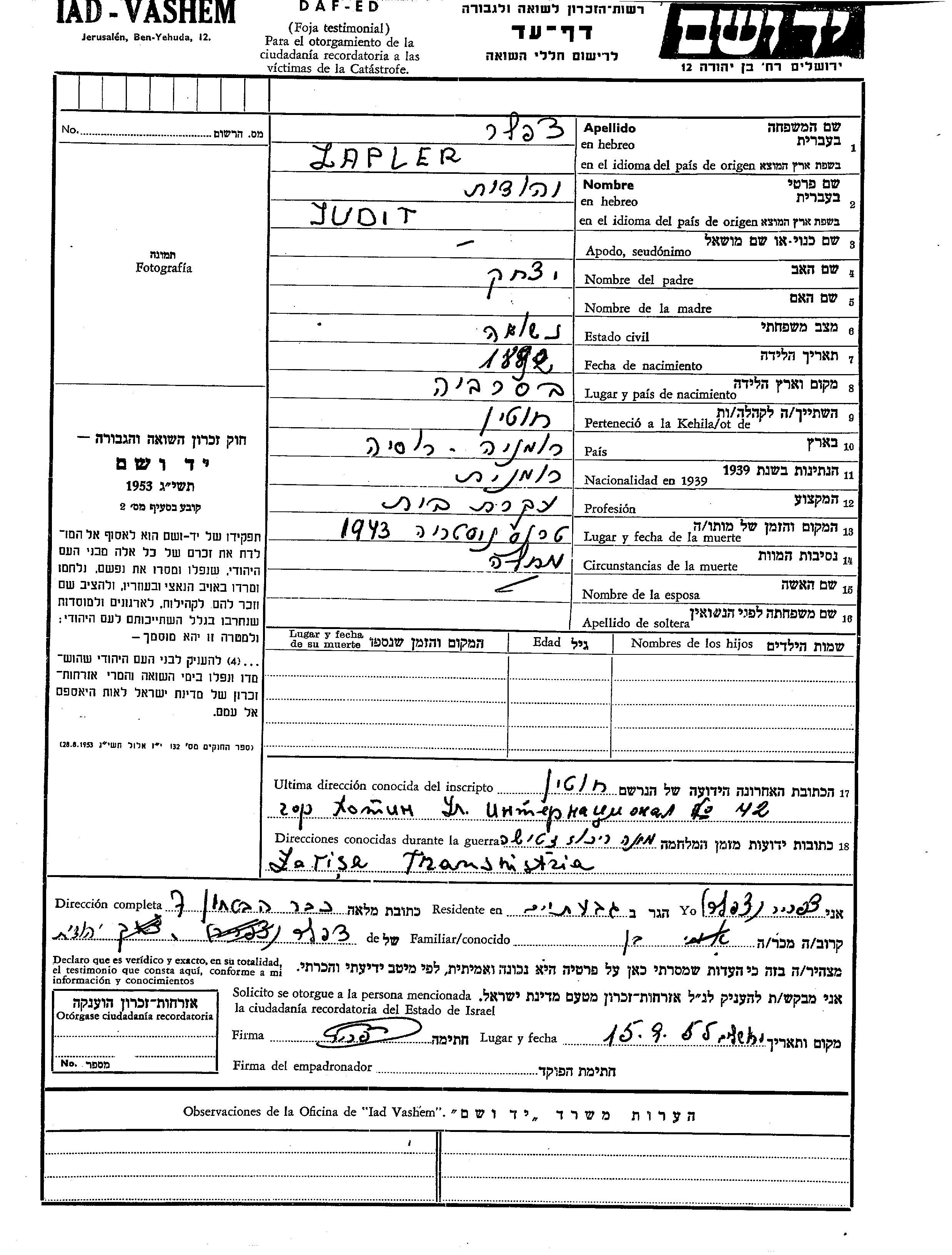 Judit Zapler est née à Bessarabia, Roumanie en 1892, fille de Yitzkhak. Elle était Femme au foyer et Mariée. Avant la seconde guerre mondiale elle vivait à Hotin, Roumanie. Pendant la guerre, elle était à Transnistria, Ukraine (URSS).