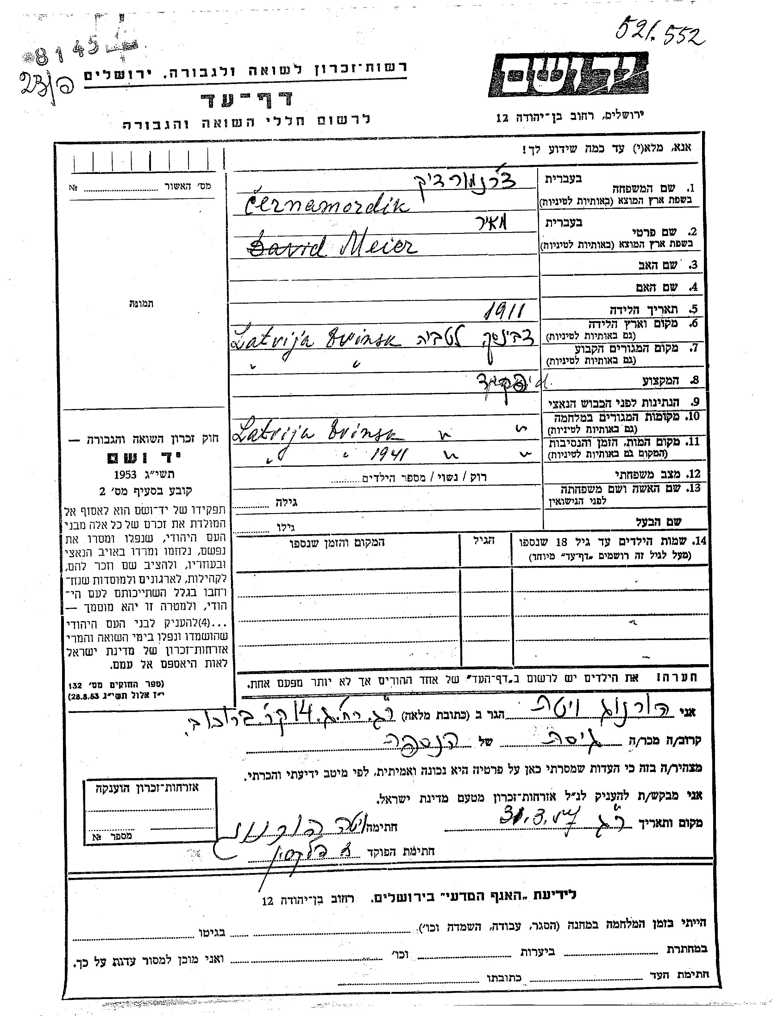 Cernamordik Meir 1911 Dvinsk, Lettonie Feuille de témoignage