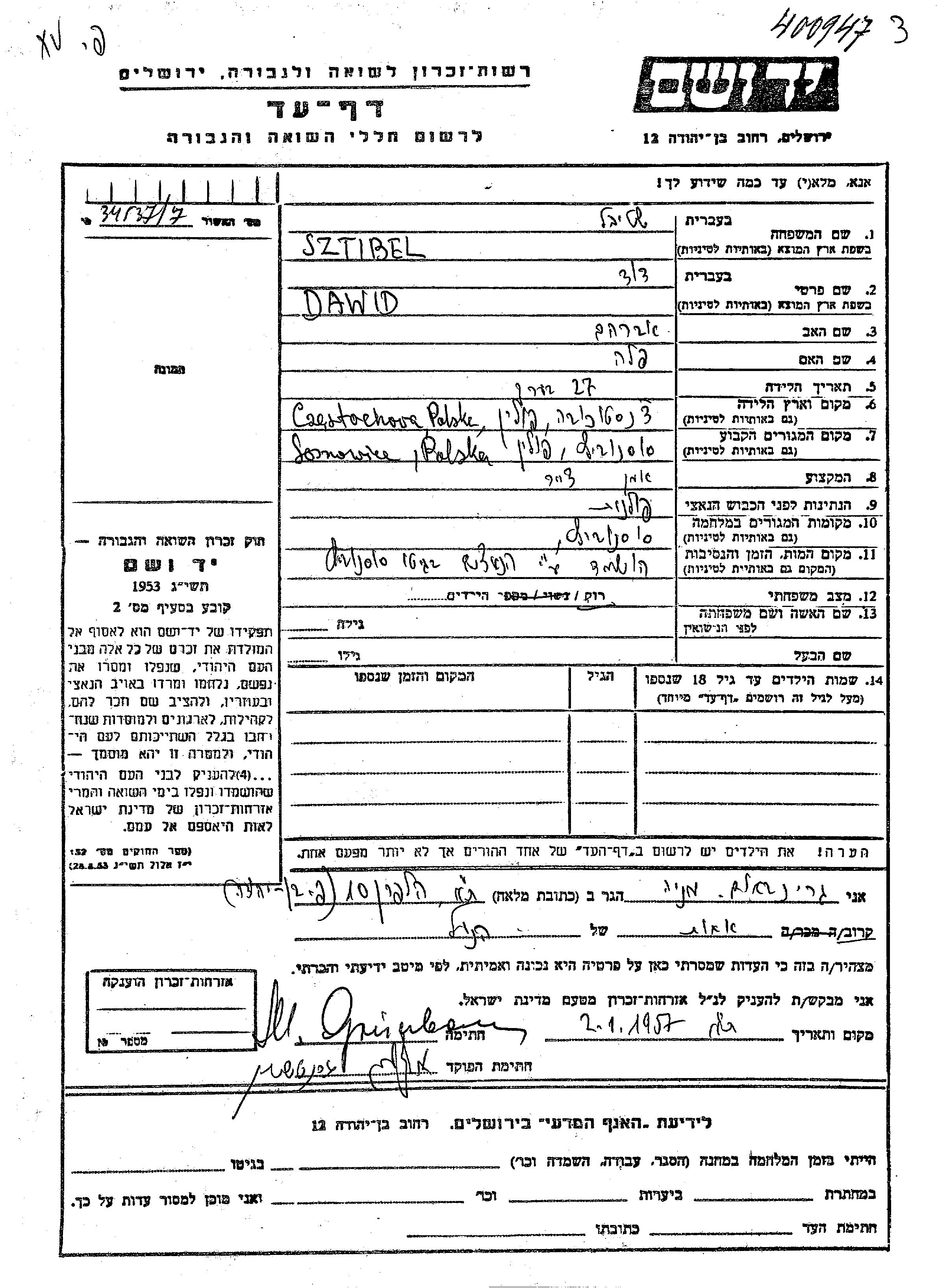 Sztibel Dawid Sosnowiec, Pologne Feuille de témoignage