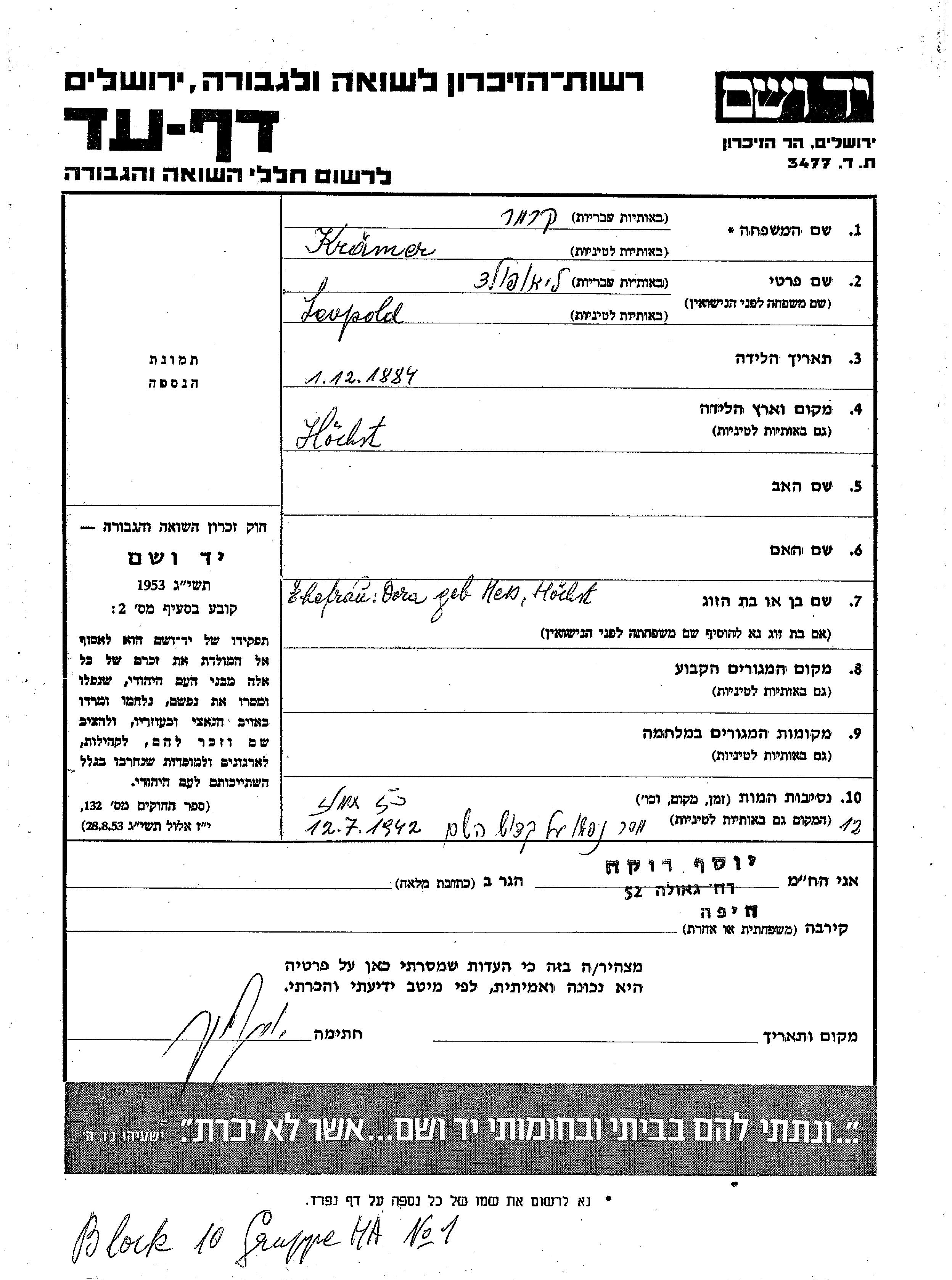 Kramer Liopold 1884 endroit inconnu, Feuille de témoignage