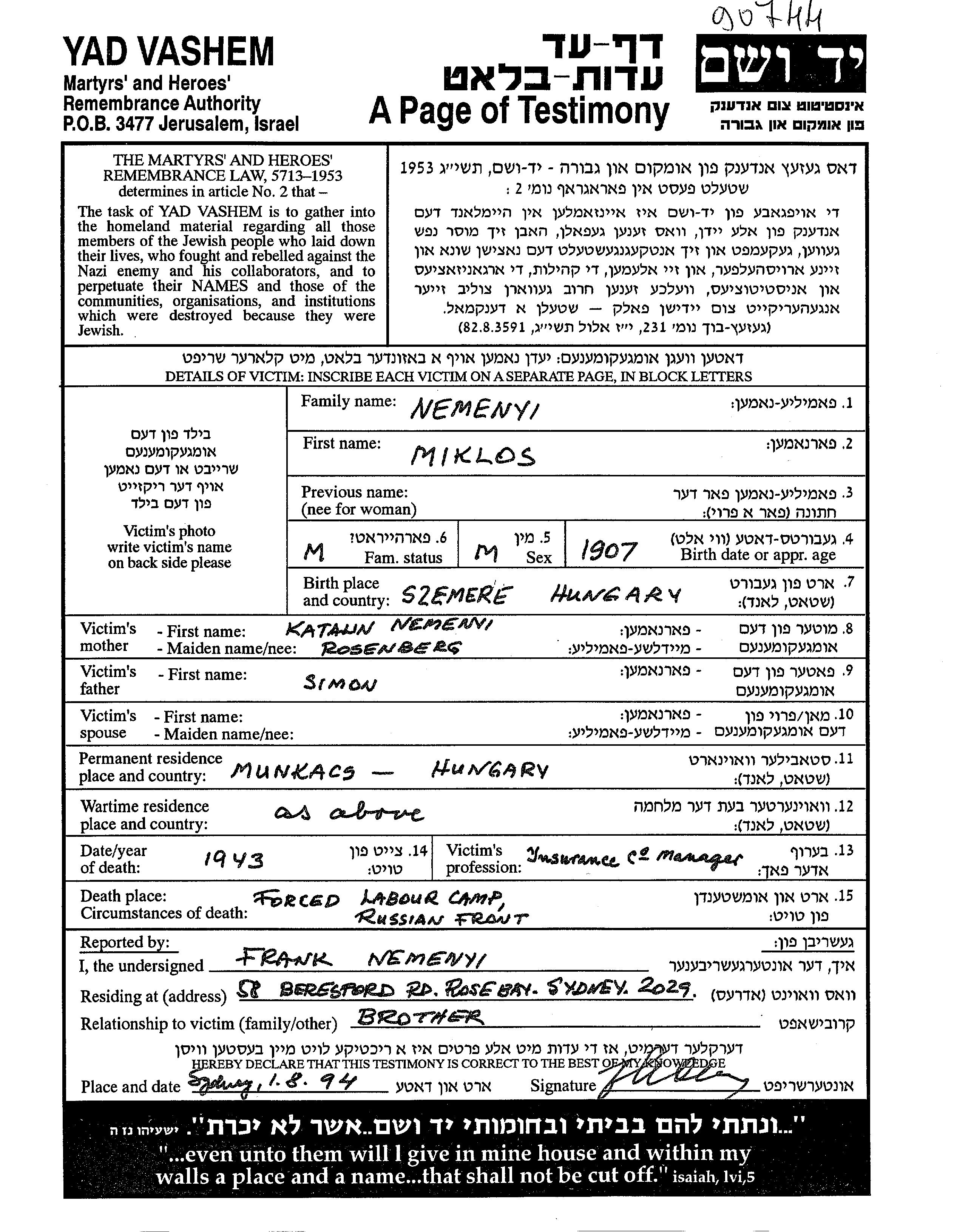 Nemenyi Miklos 1907 Munkacs, Tchécoslovaquie Feuille de témoignage