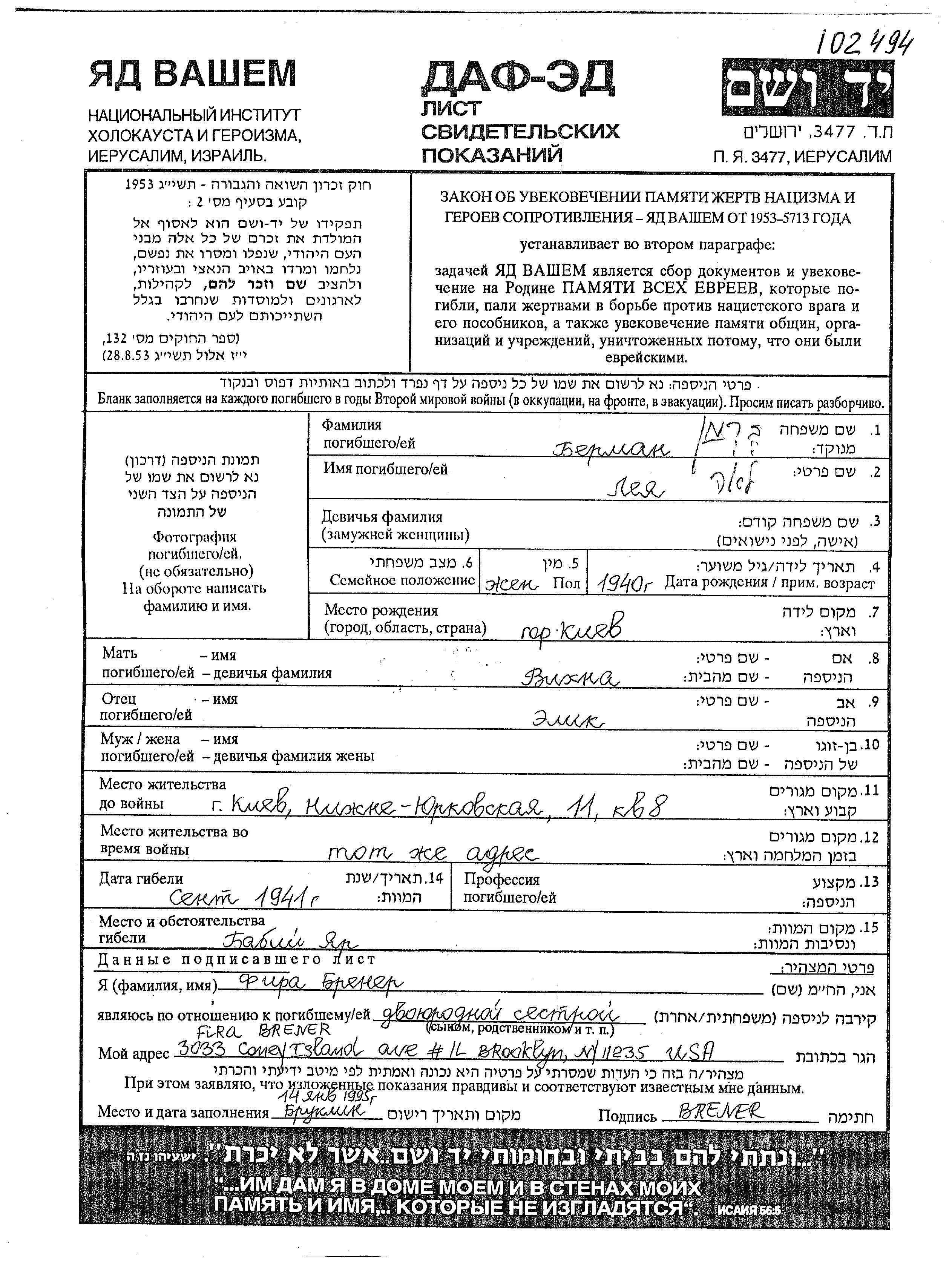 Berman Lea 1940 Kiyev, Ukraine (URSS) Feuille de témoignage