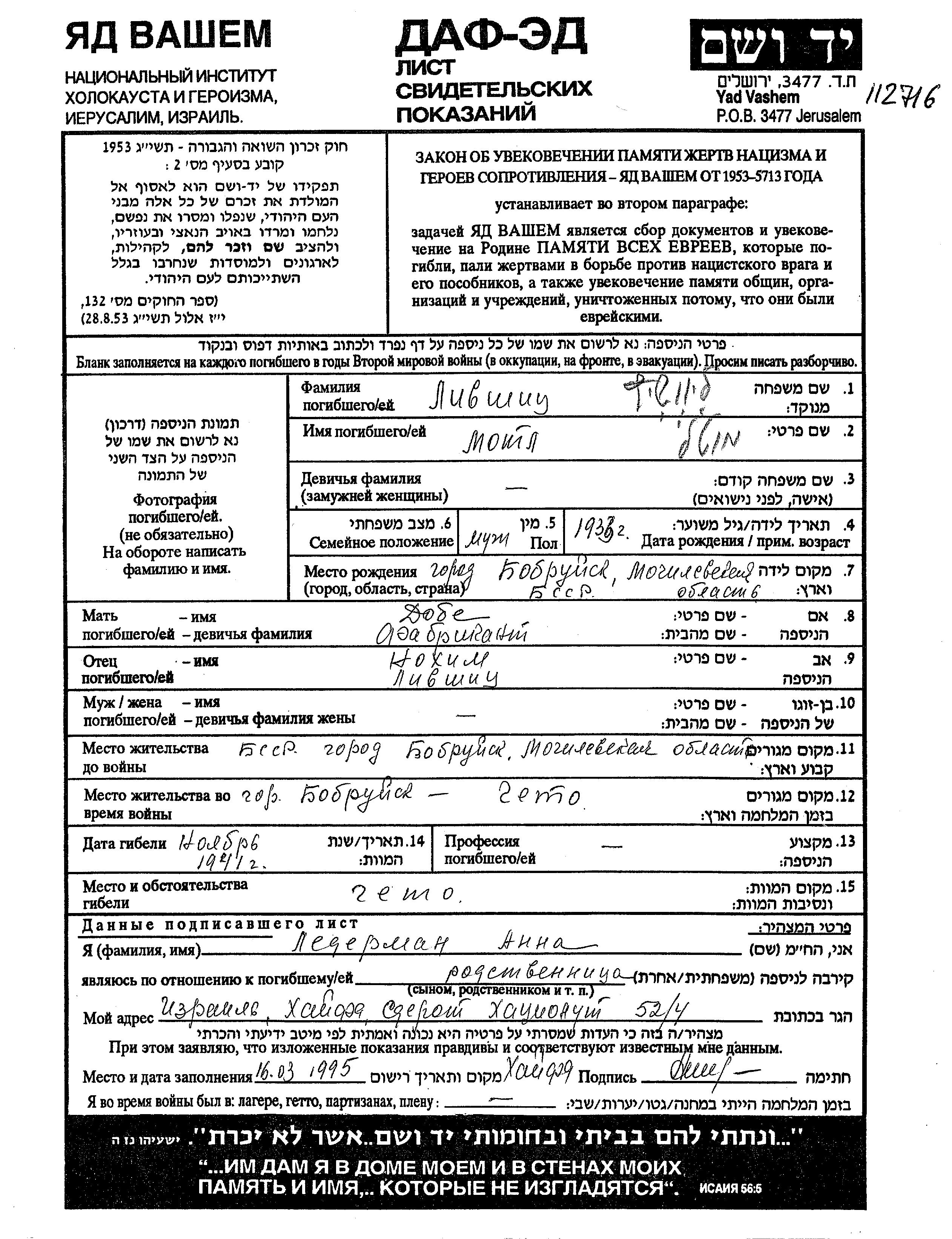 Livshitz Motl 1933 Bobruysk, Bélorussie (URSS) Feuille de témoignage