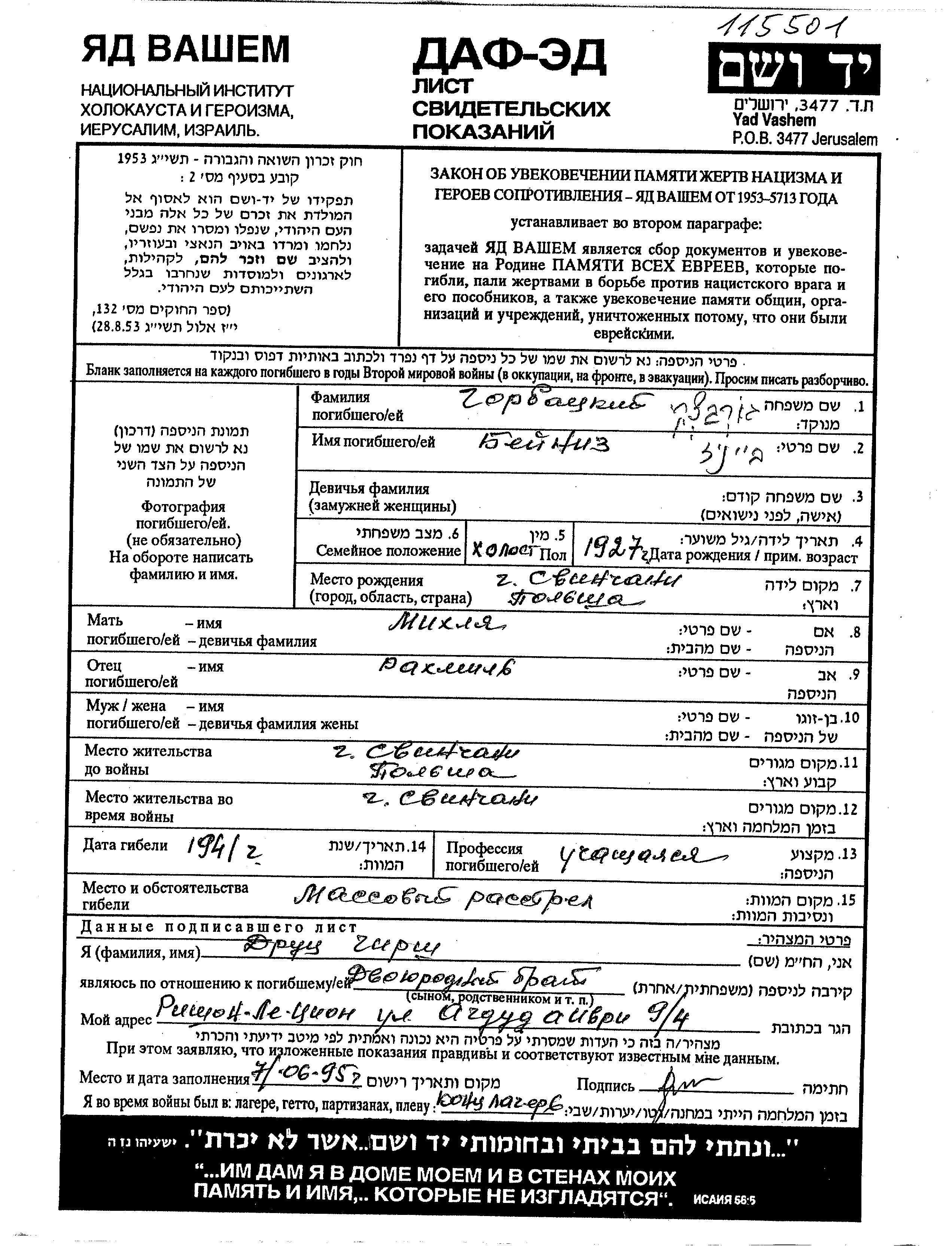 Gorbatzki Beiniz 1927 Swieciany, Pologne Feuille de témoignage