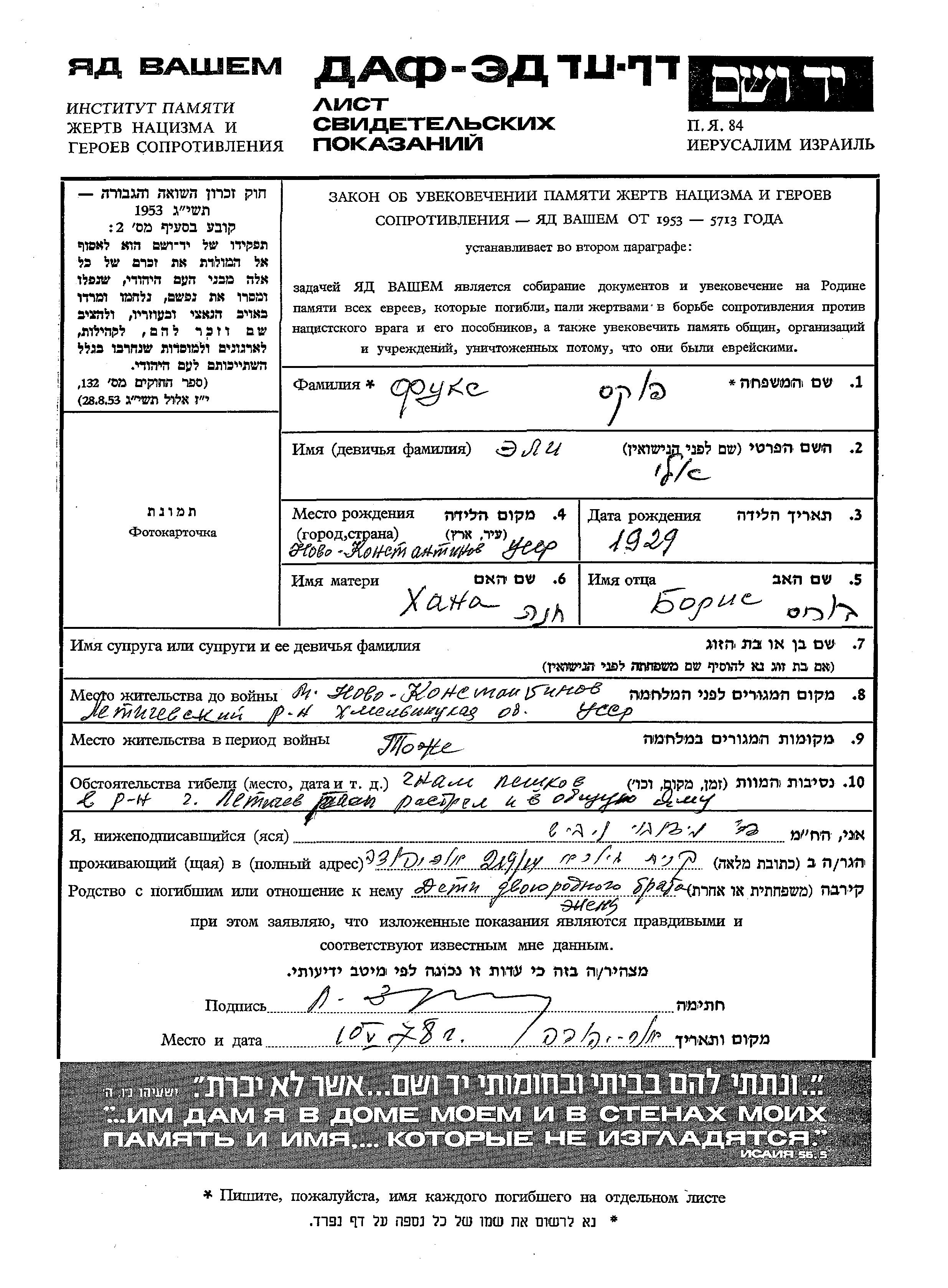 Fuks Eli 1929 Novo Konstantinov, Ukraine (URSS) Feuille de témoignage