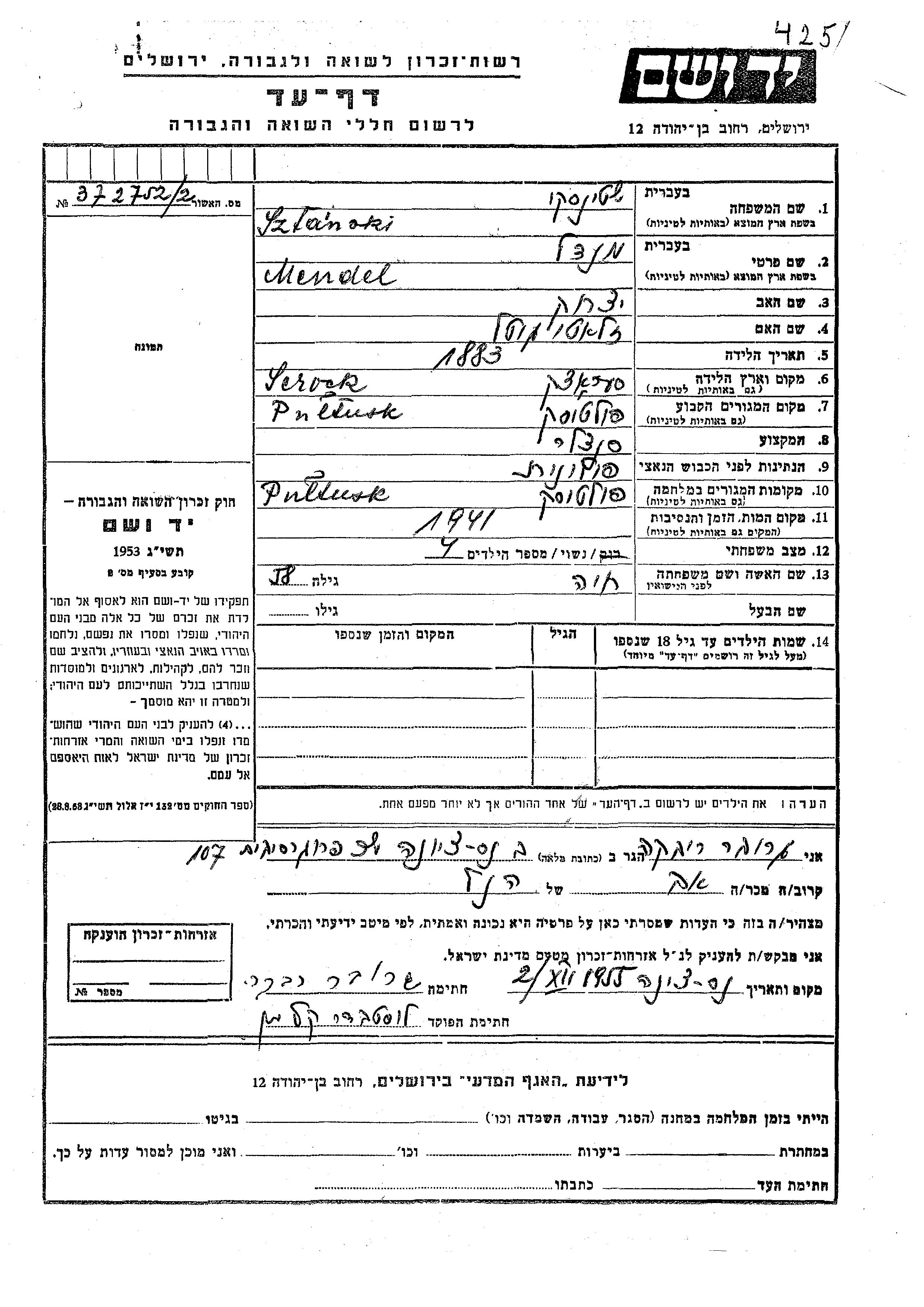 Mendel Sztainski est né à Serock, Pologne en 1883, fils de Yitzkhak et de Zlato Gitel. Il était Cordonnier et Mariée à Khaia. Avant la seconde guerre mondiale il vivait à Pultusk, Pologne. Au cours de la guerre, il était à Pultusk, Pologne.