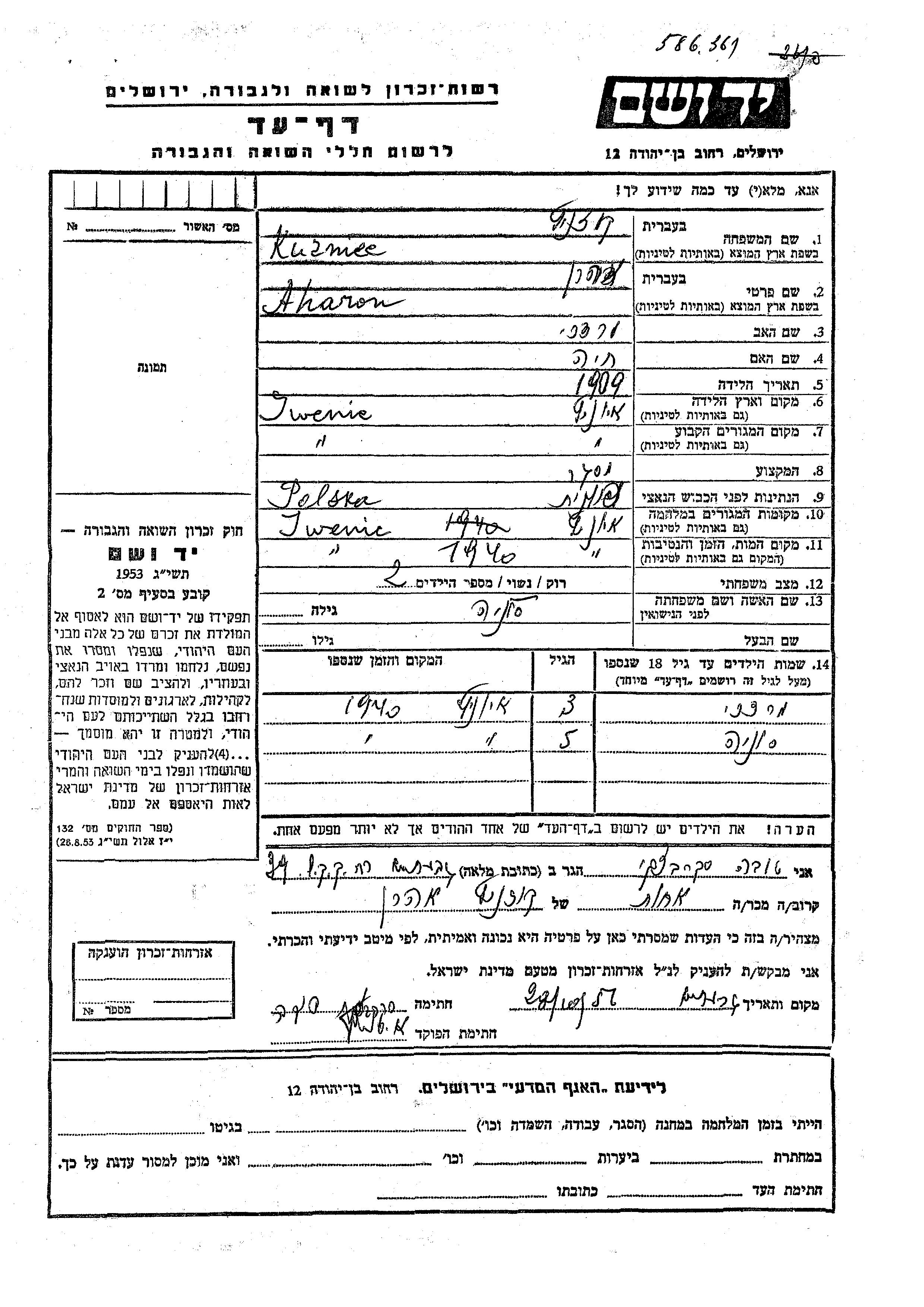 Kuzniec Aharon 1909 Iwieniec, Pologne Feuille de témoignage