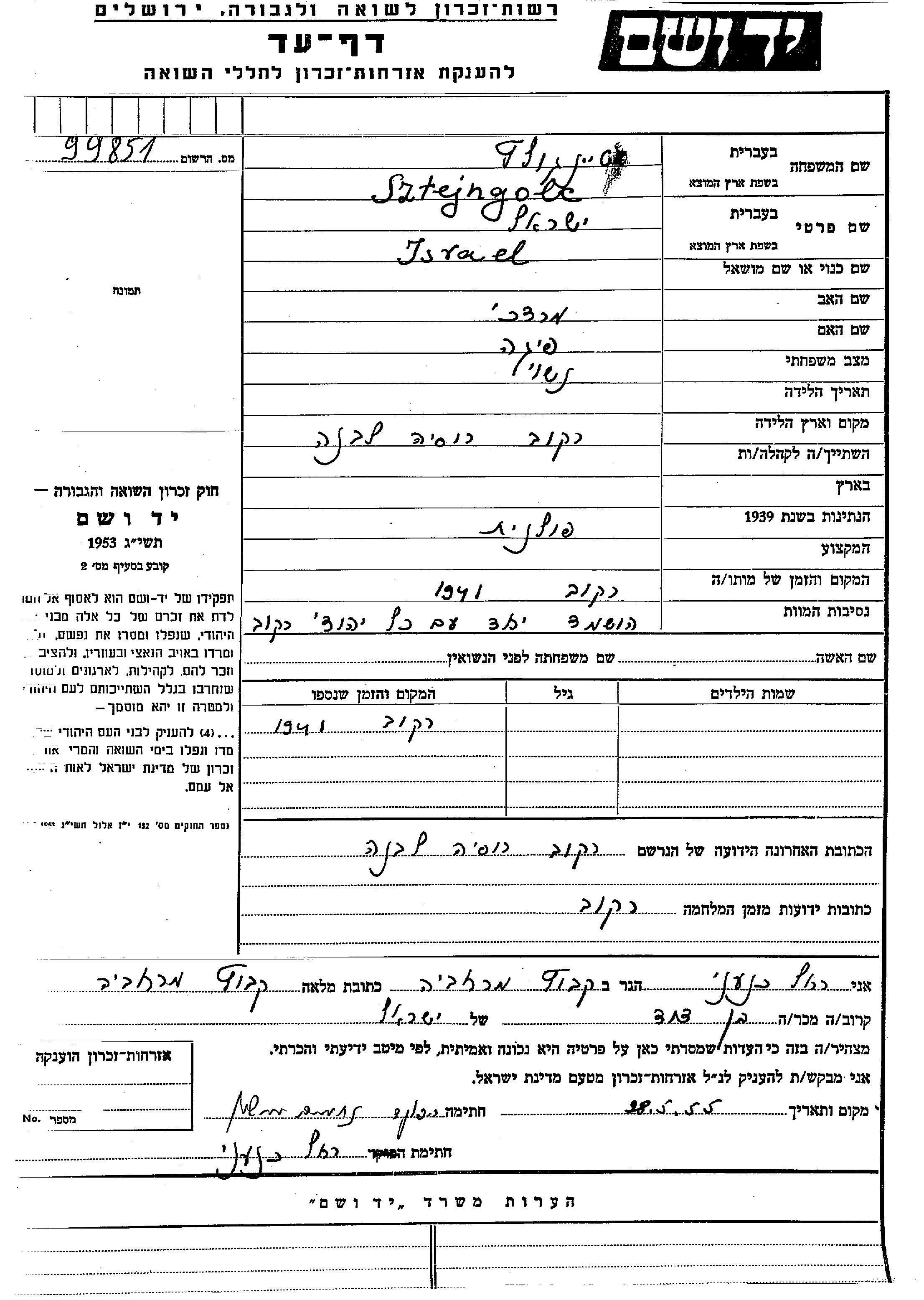 Sztejngolc Shteingolts Israel endroit inconnu, Feuille de témoignage