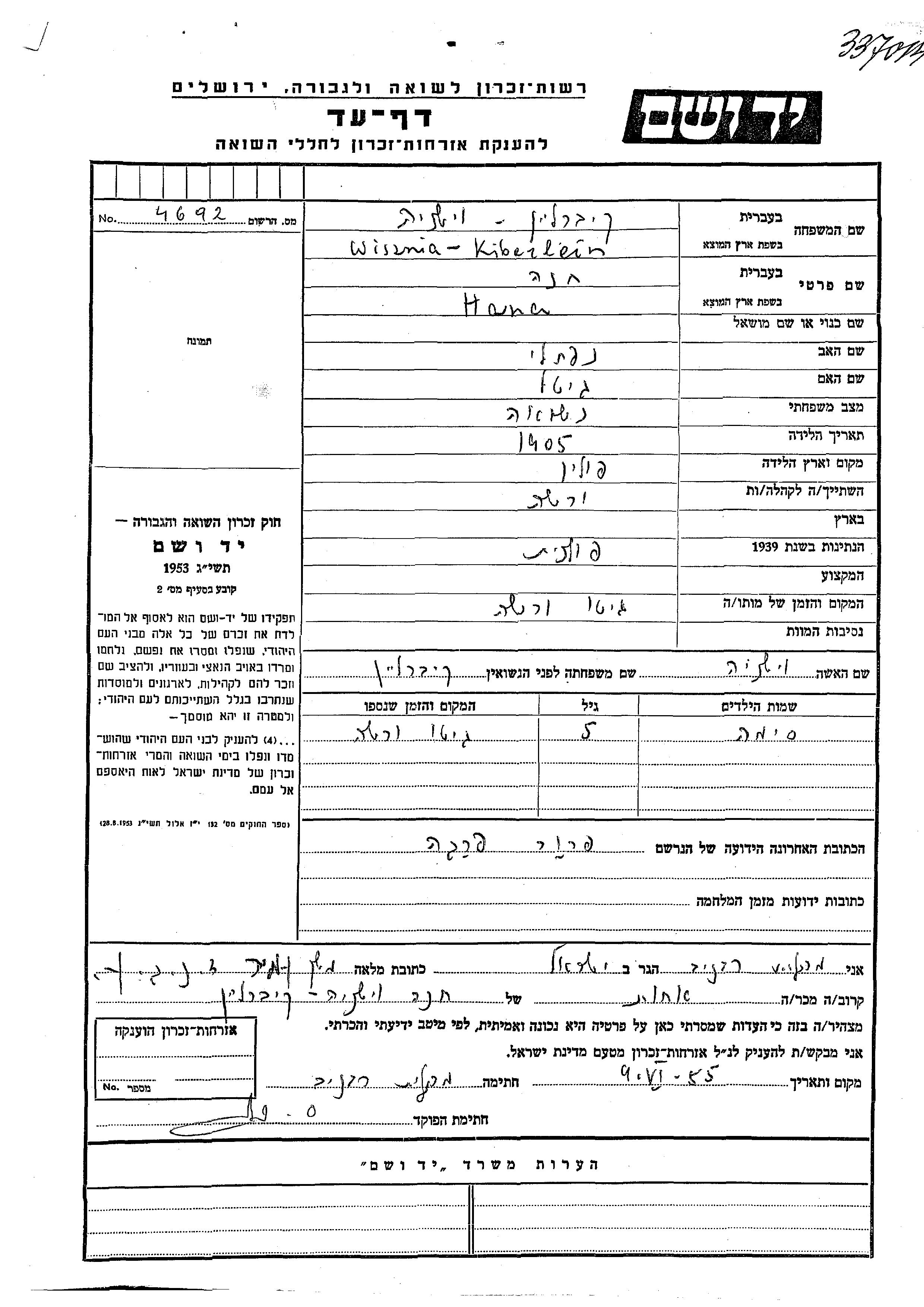 Wisznia Kiberlein Hana 1905 endroit inconnu, Feuille de témoignage