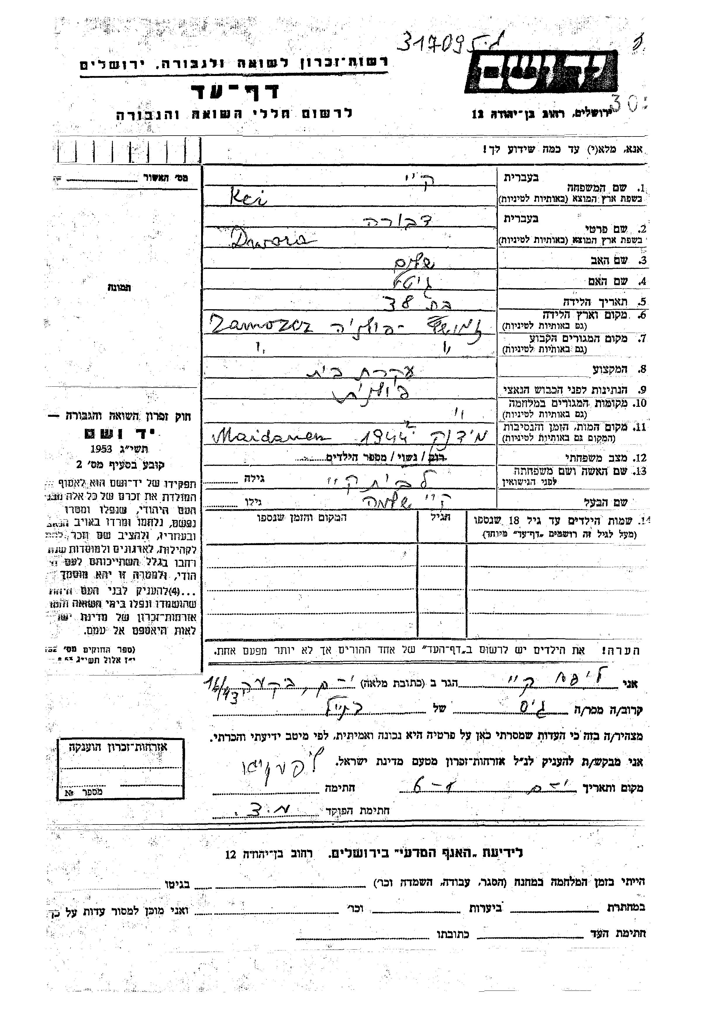 Kei Dwora Zamosc, Pologne Feuille de témoignage