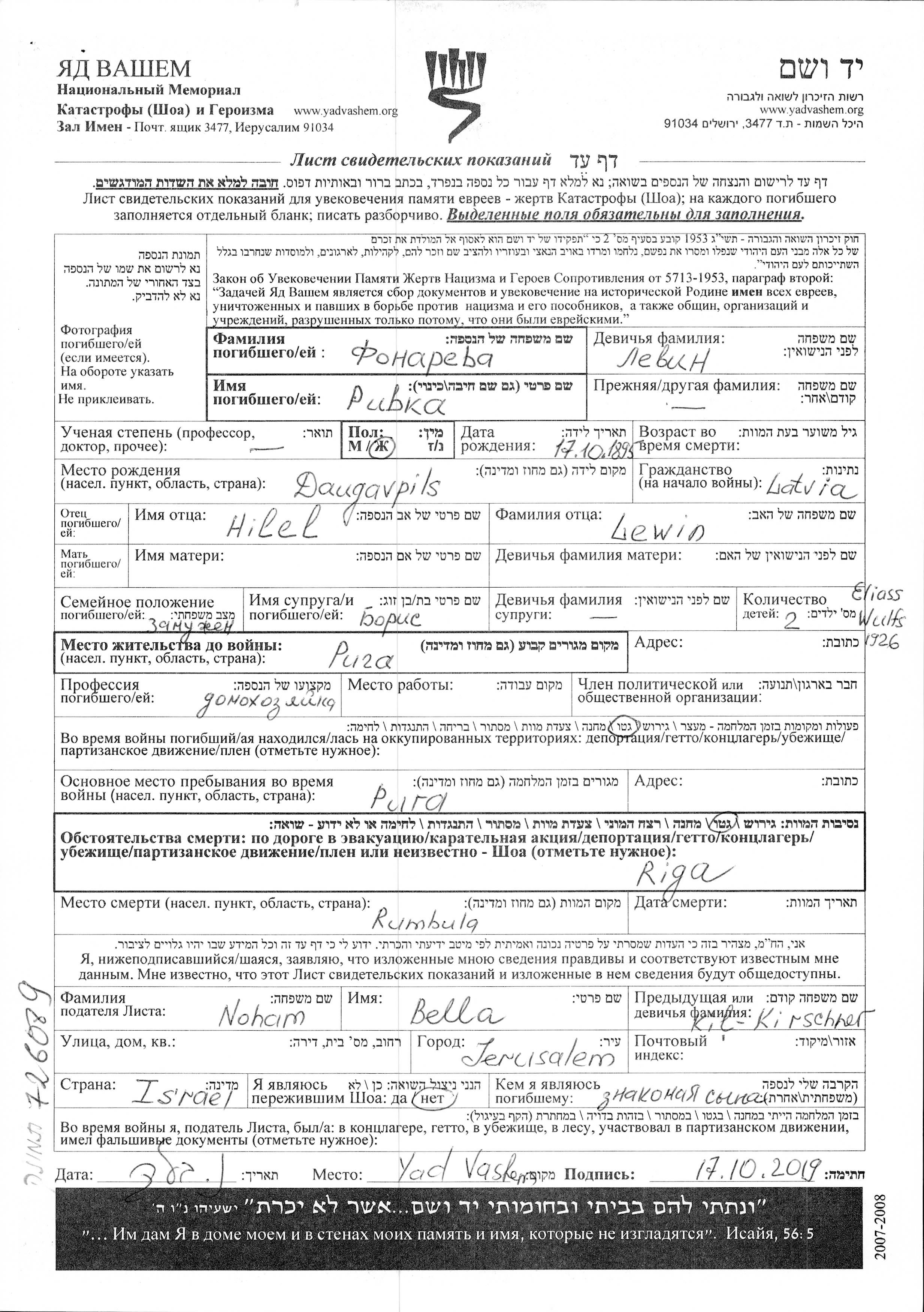 Fonareva | Rivka | 1895 | Riga, Lettonie | Feuille de témoignage |