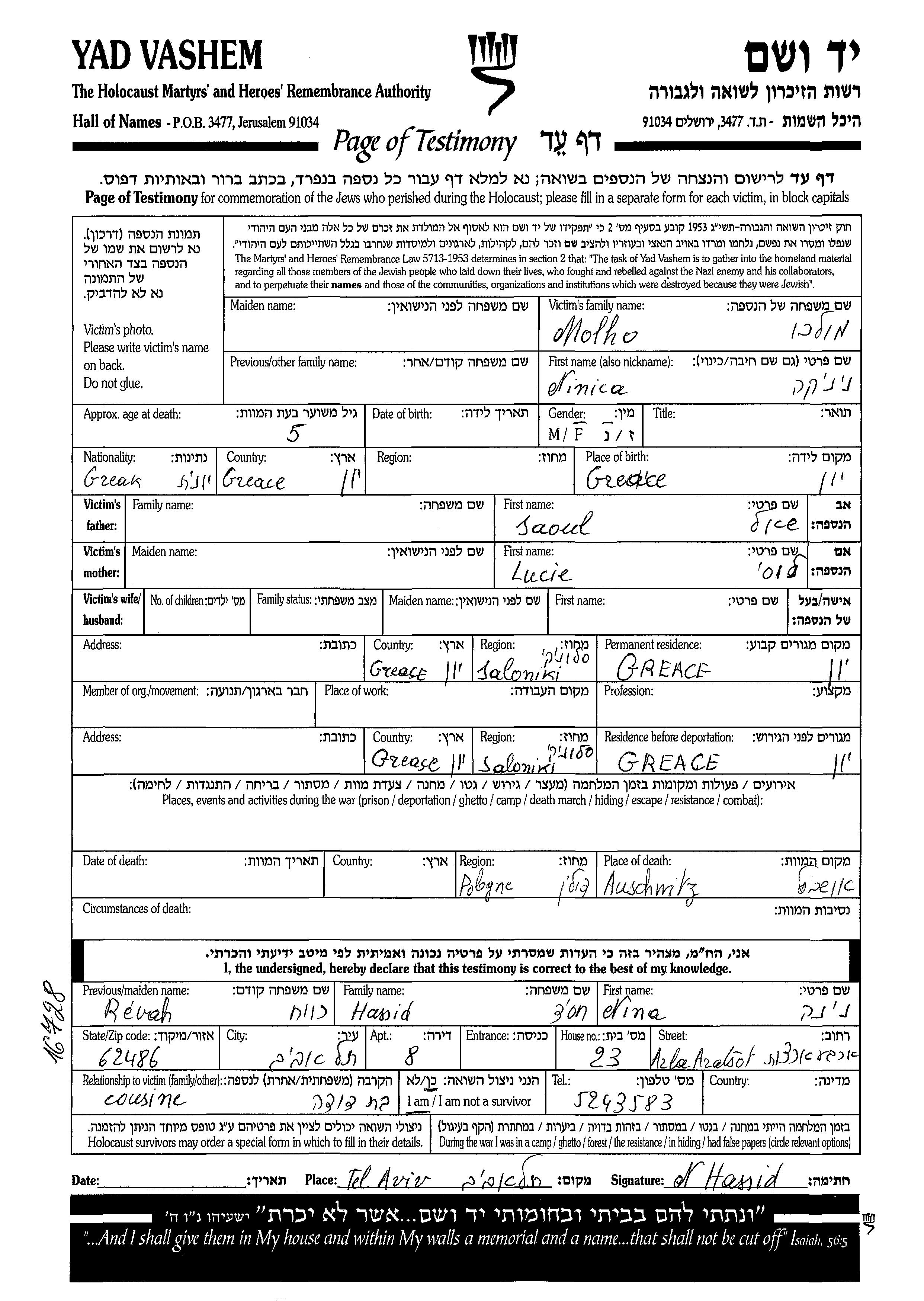 Molcho Ninette 1932 Saloniki, Grèce Feuille de témoignage