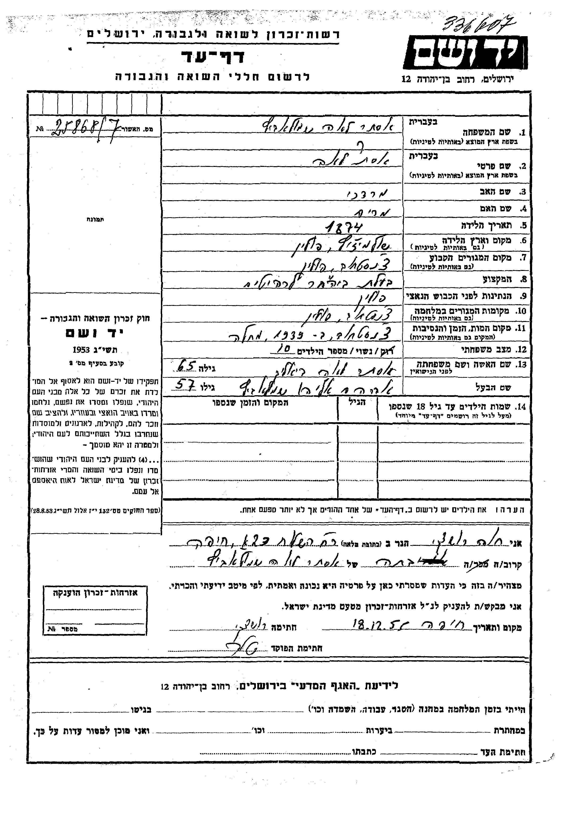Yad Vashem - Pages of Testimony Names Memorial Collection