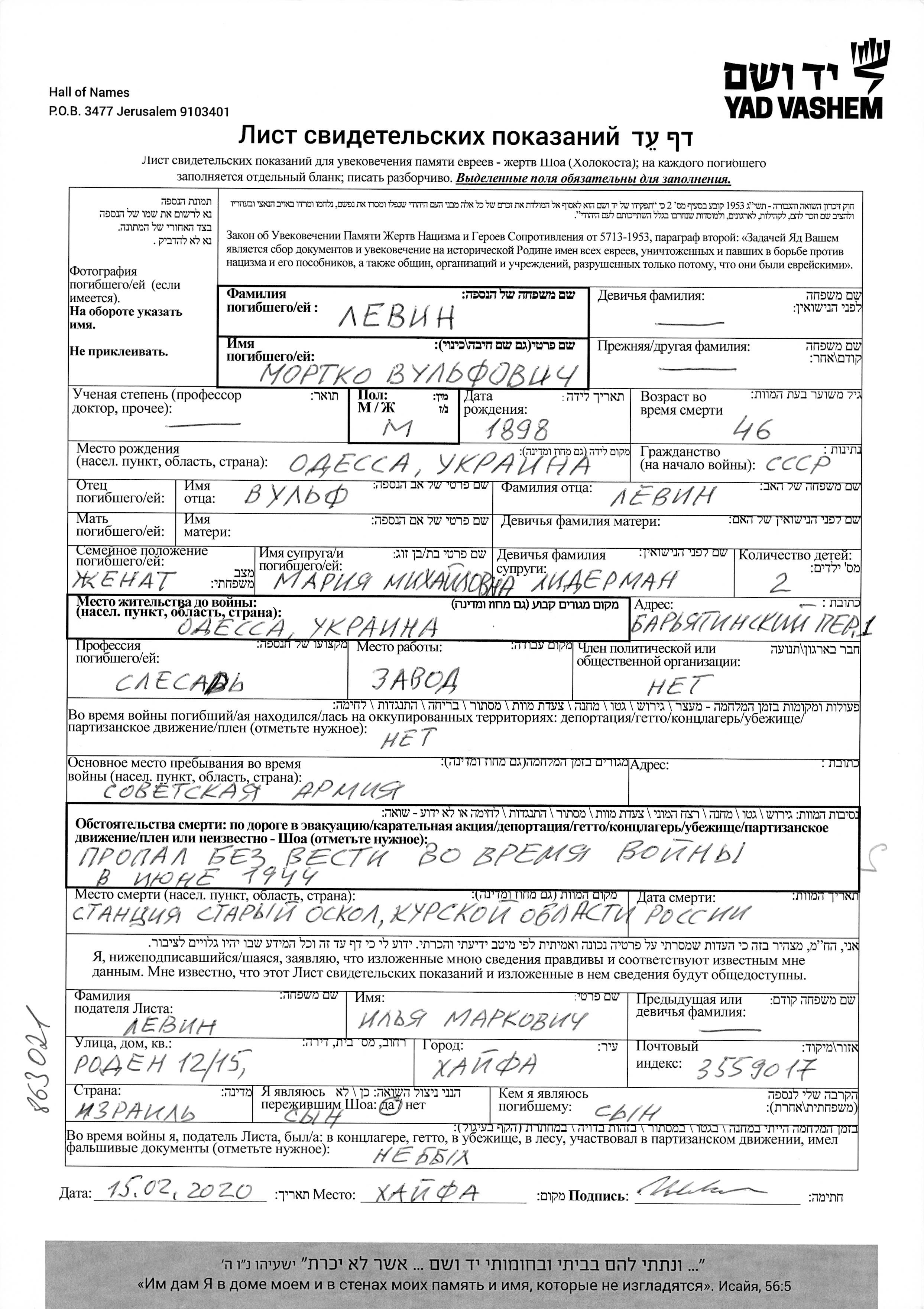 Levin Mortko 1898 Odessa, Ukraine (URSS) Feuille de témoignage