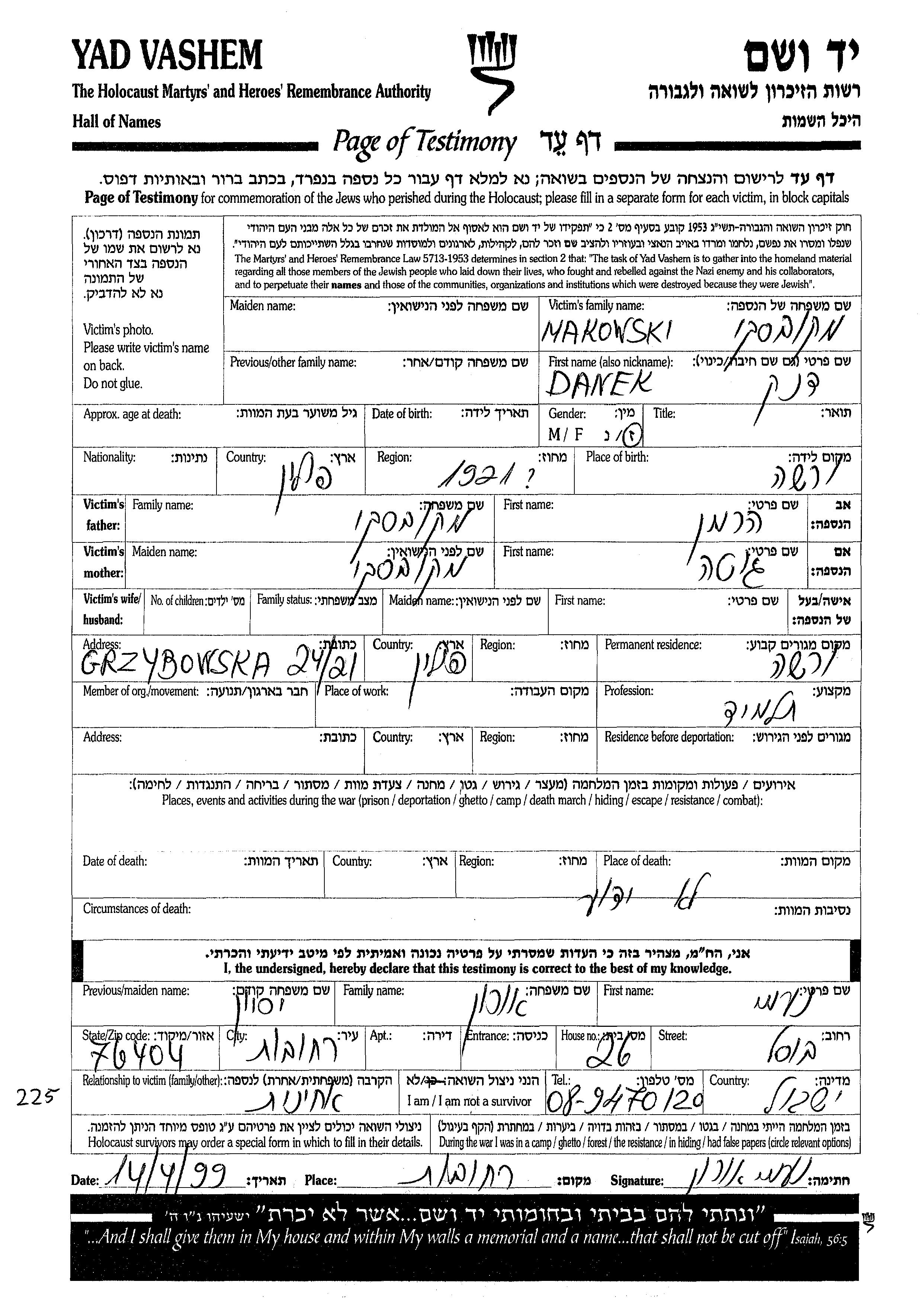 Makowski Daniel 1921 Varsha, Pologne Feuille de témoignage