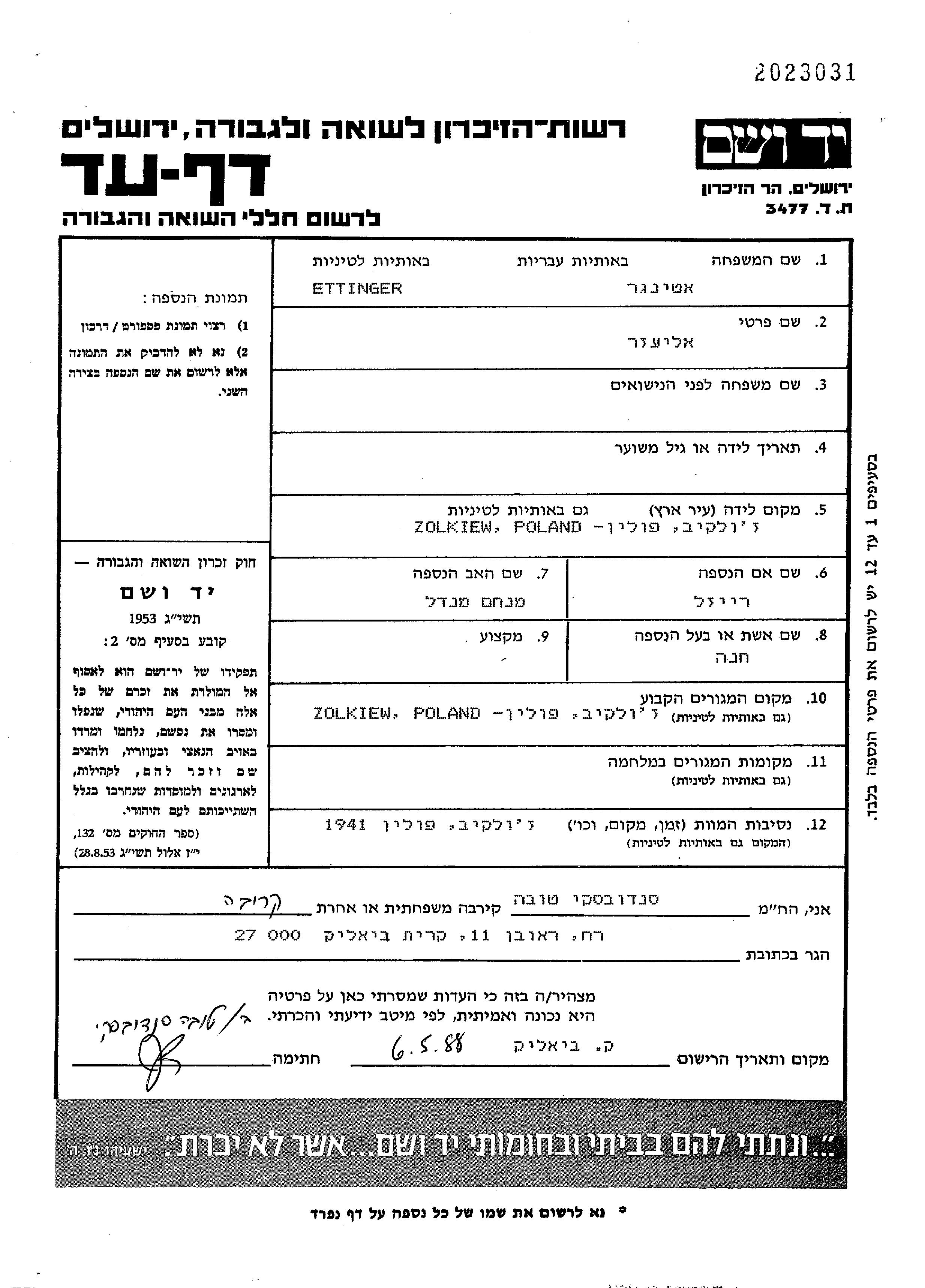 Ettinger Eliezer Zolkiew, Pologne Feuille de témoignage