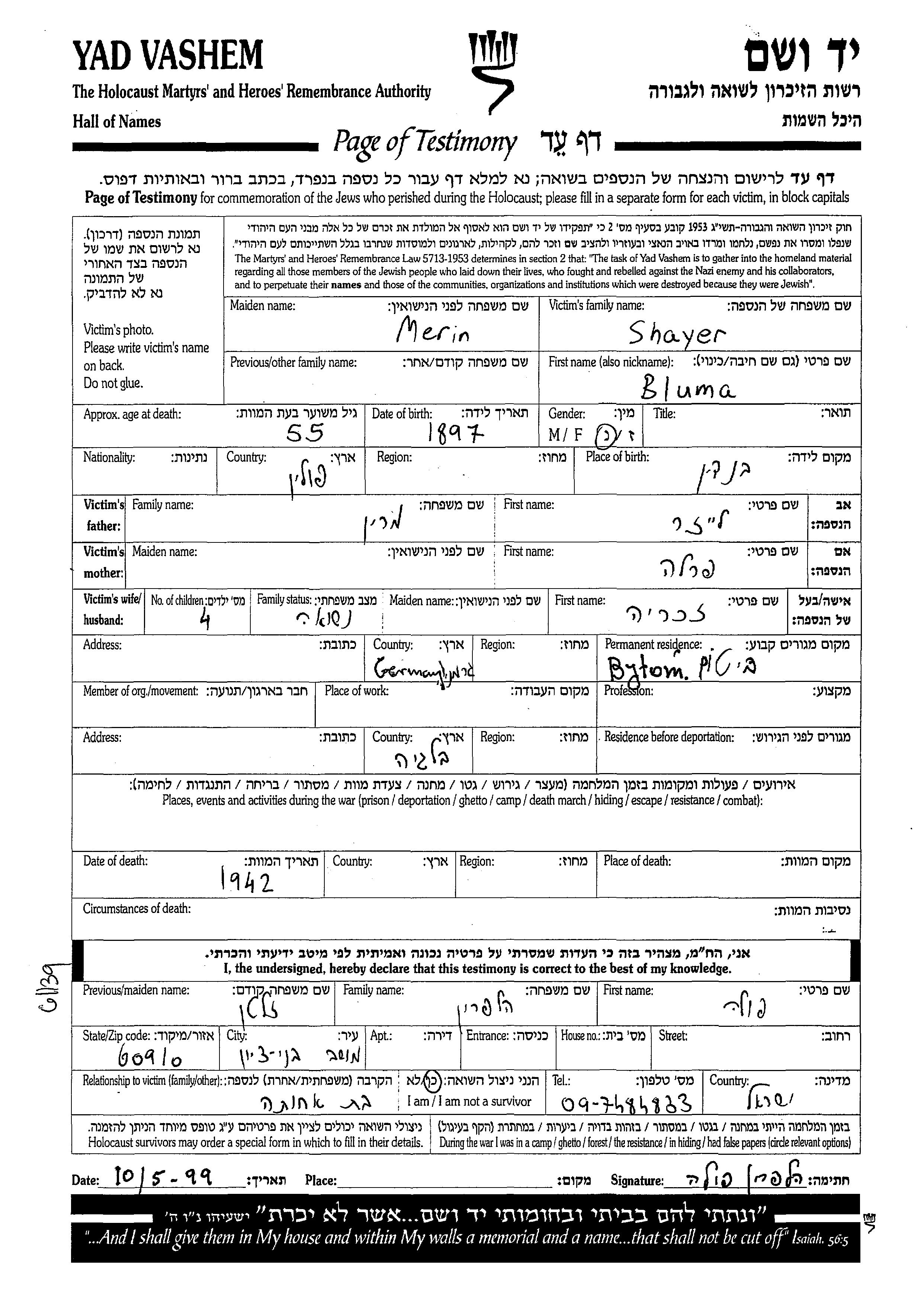 Shayer Bluma 1897 Bytom, Allemagne Feuille de témoignage