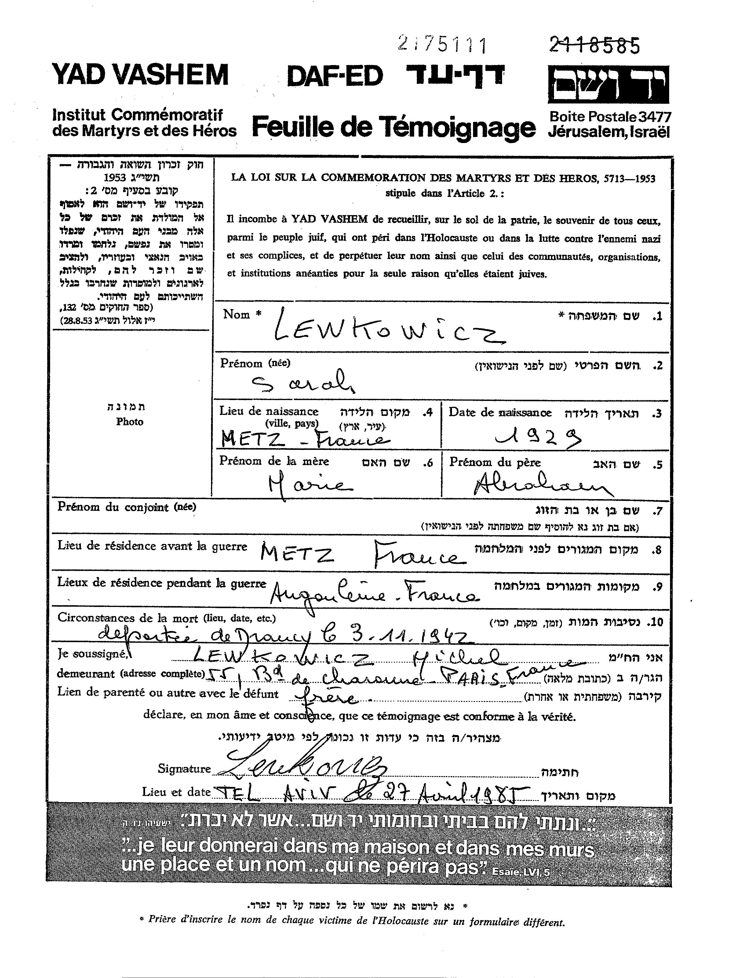 Lewkowicz | Sarah | 1929 | Metz, France | Feuille de témoignage |