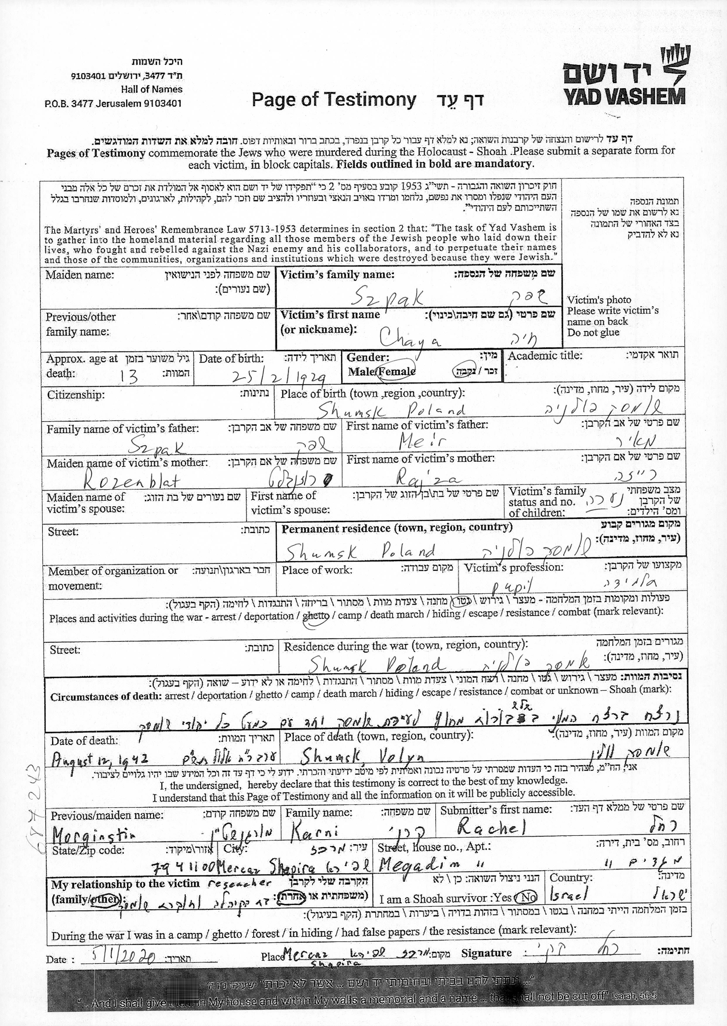 Szpak Chaya 1929 Szumsk, Pologne Feuille de témoignage