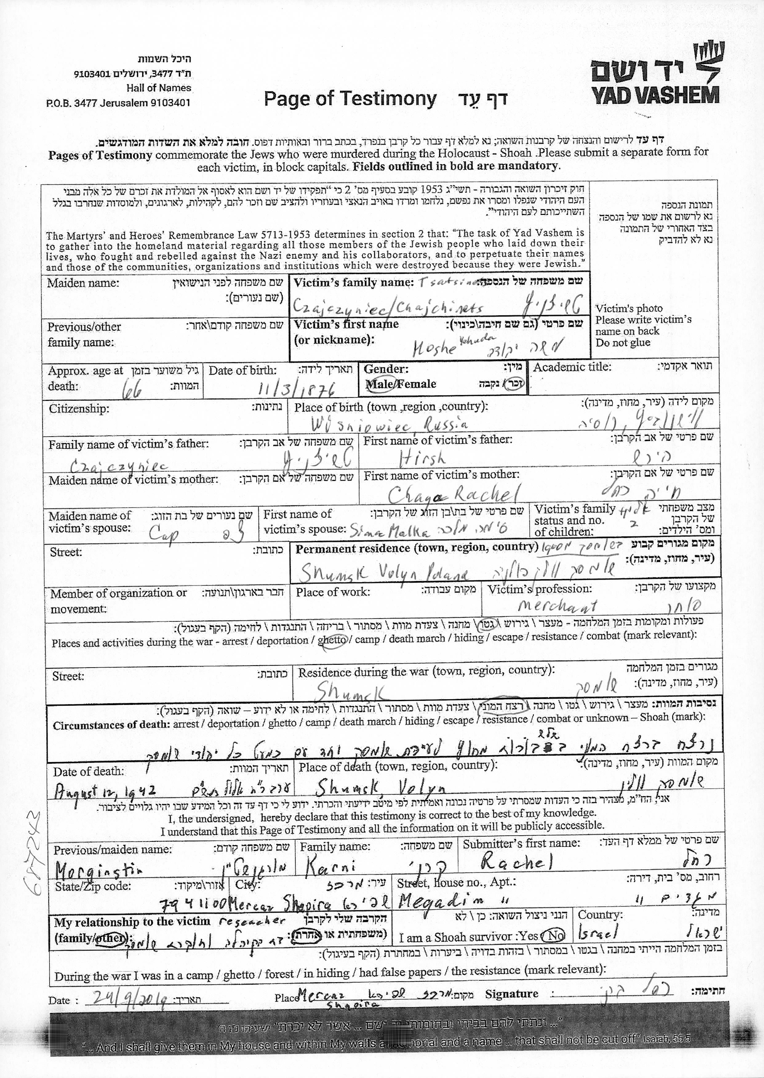 Czajczyniec Moshe Yehuda 1876 Szumsk, Pologne Feuille de témoignage