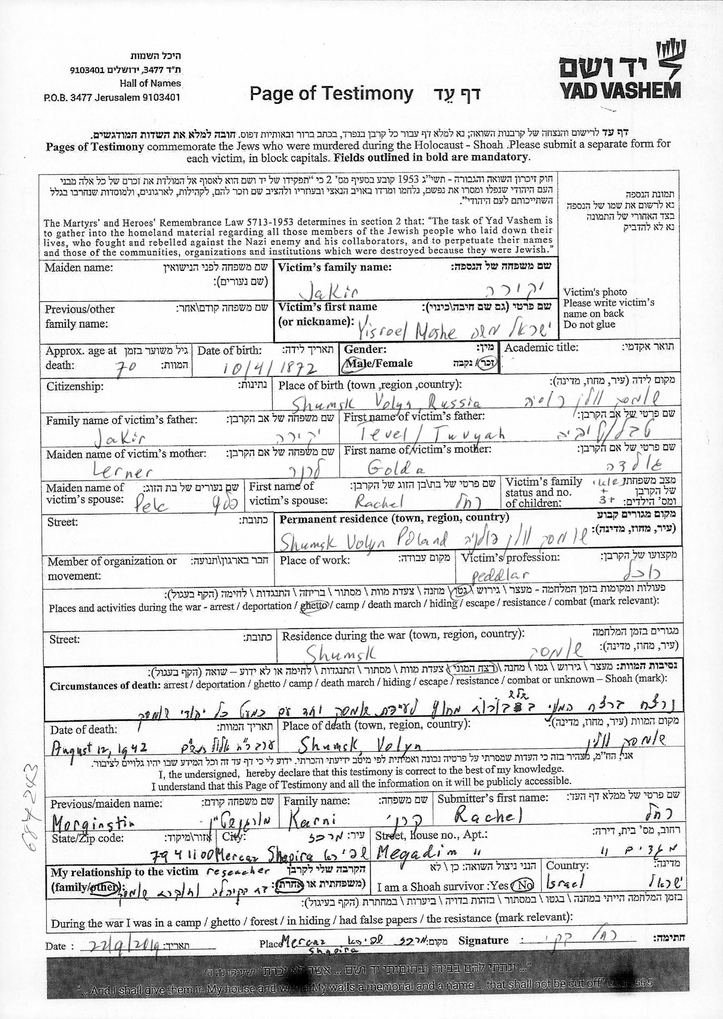 Yisroel Moshe Jakir Iakira est né à Szumsk, Pologne en 1872, fils de Tevel et de Golda née Lerner. Il était Colporteur/colporteuse et Mariée à Rachel née Pelc. Avant la seconde guerre mondiale il vivait à Szumsk, Pologne. Au cours de la guerre, il était à Szumsk, Pologne.