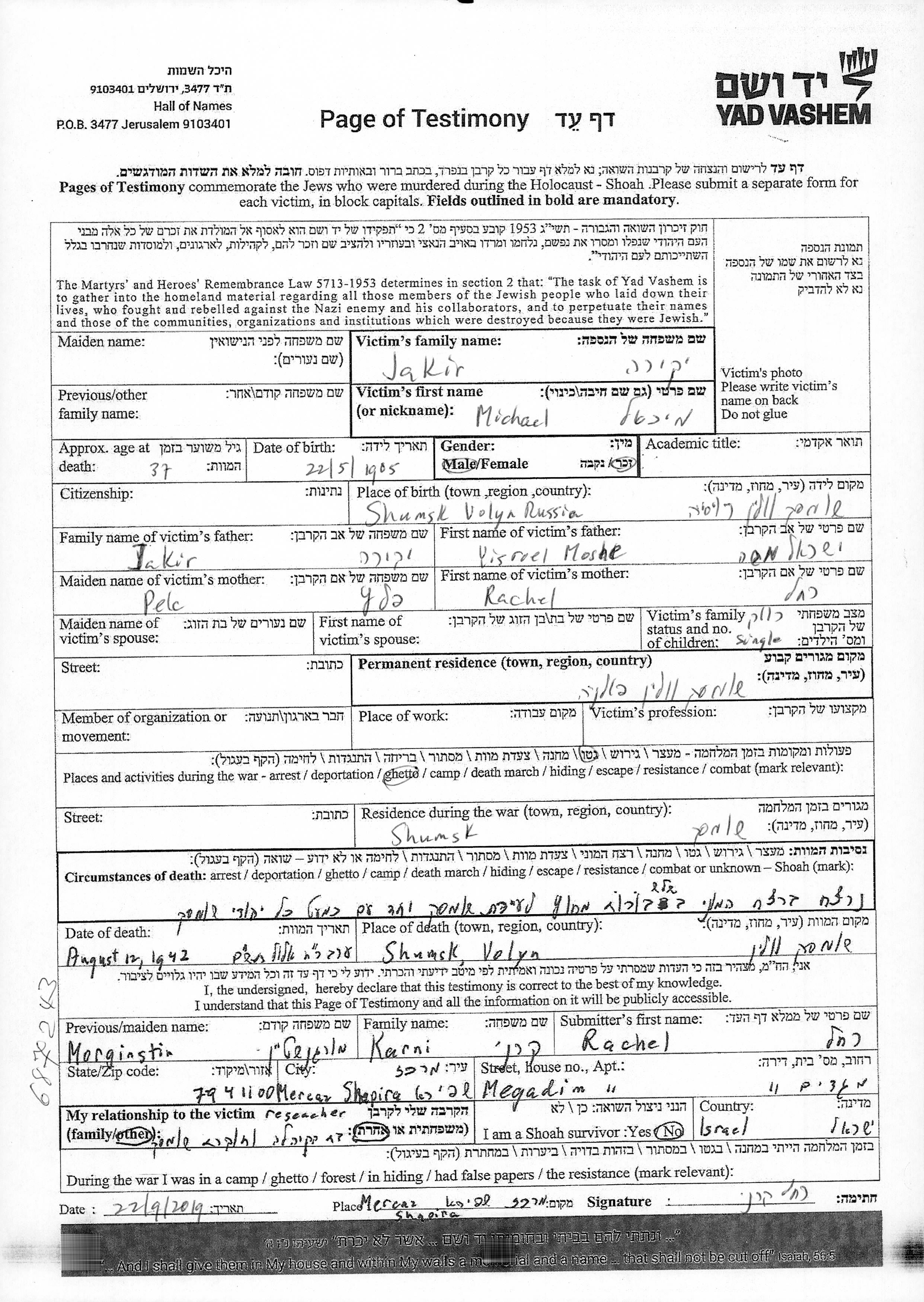 Jakir Iakira Michael 1905 Szumsk, Pologne Feuille de témoignage