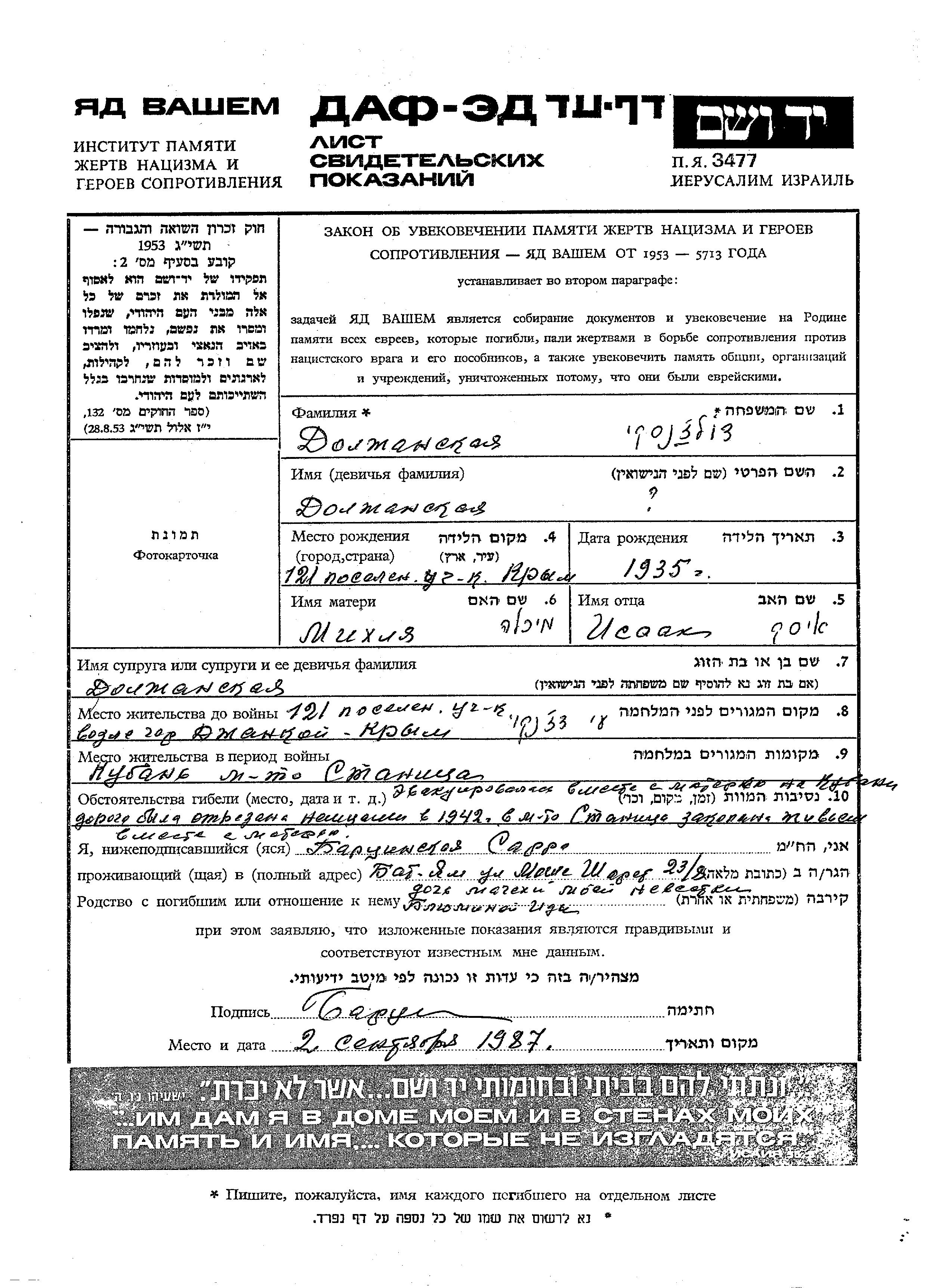 Dolzhanski | prénom inconnu | 1935 | Dzhankoi, Russie (URSS) | Feuille de témoignage |