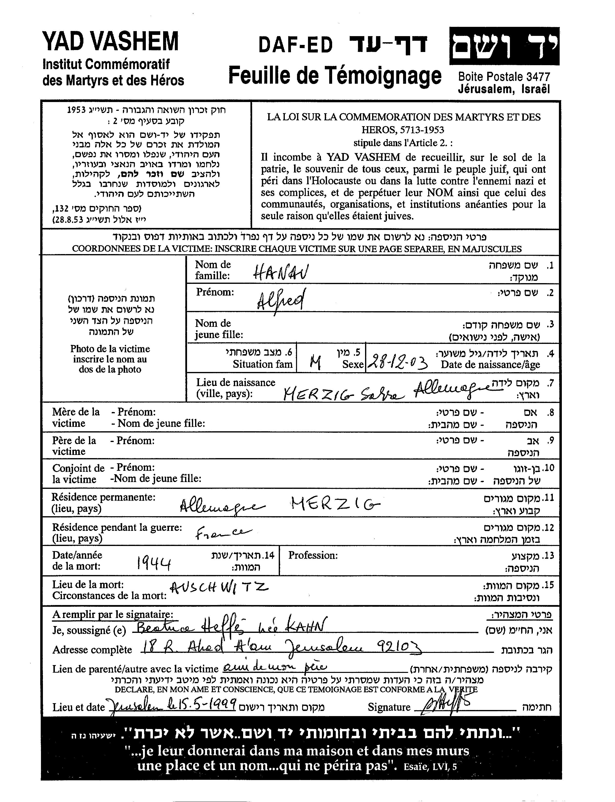 Hanau Alfred 1903 Merzig, Allemagne Feuille de témoignage