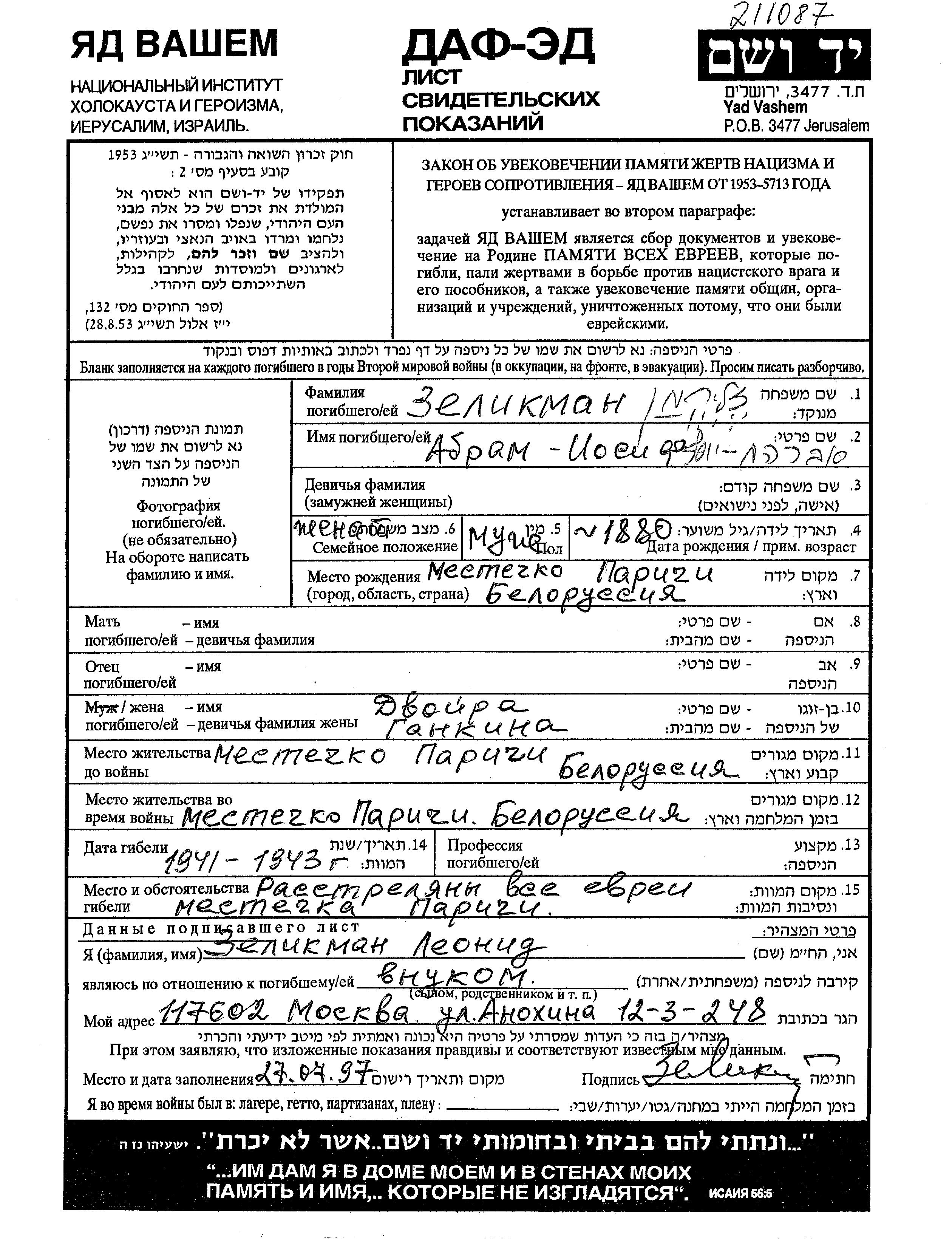 Iosif Avraham Zelikman est né à Parichi, Bélorussie (URSS) en 1879. Avant la seconde guerre mondiale il vivait à Parichi, Bélorussie (URSS).