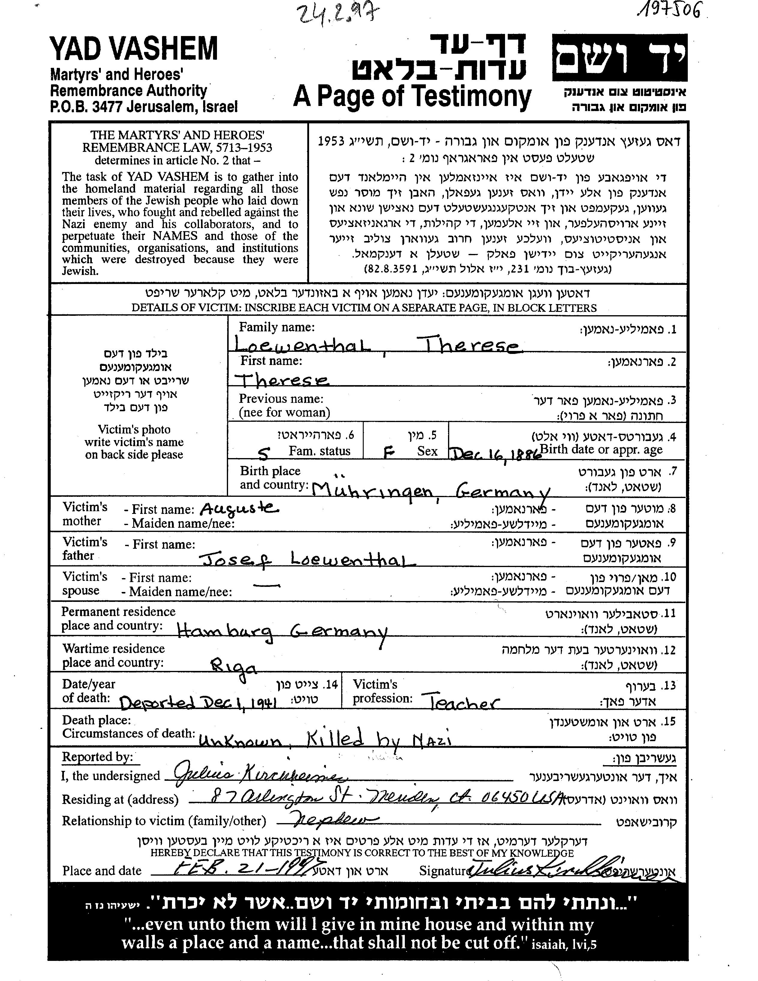 Loewenthal Therese 1886 Hamburg, Allemagne Feuille de témoignage