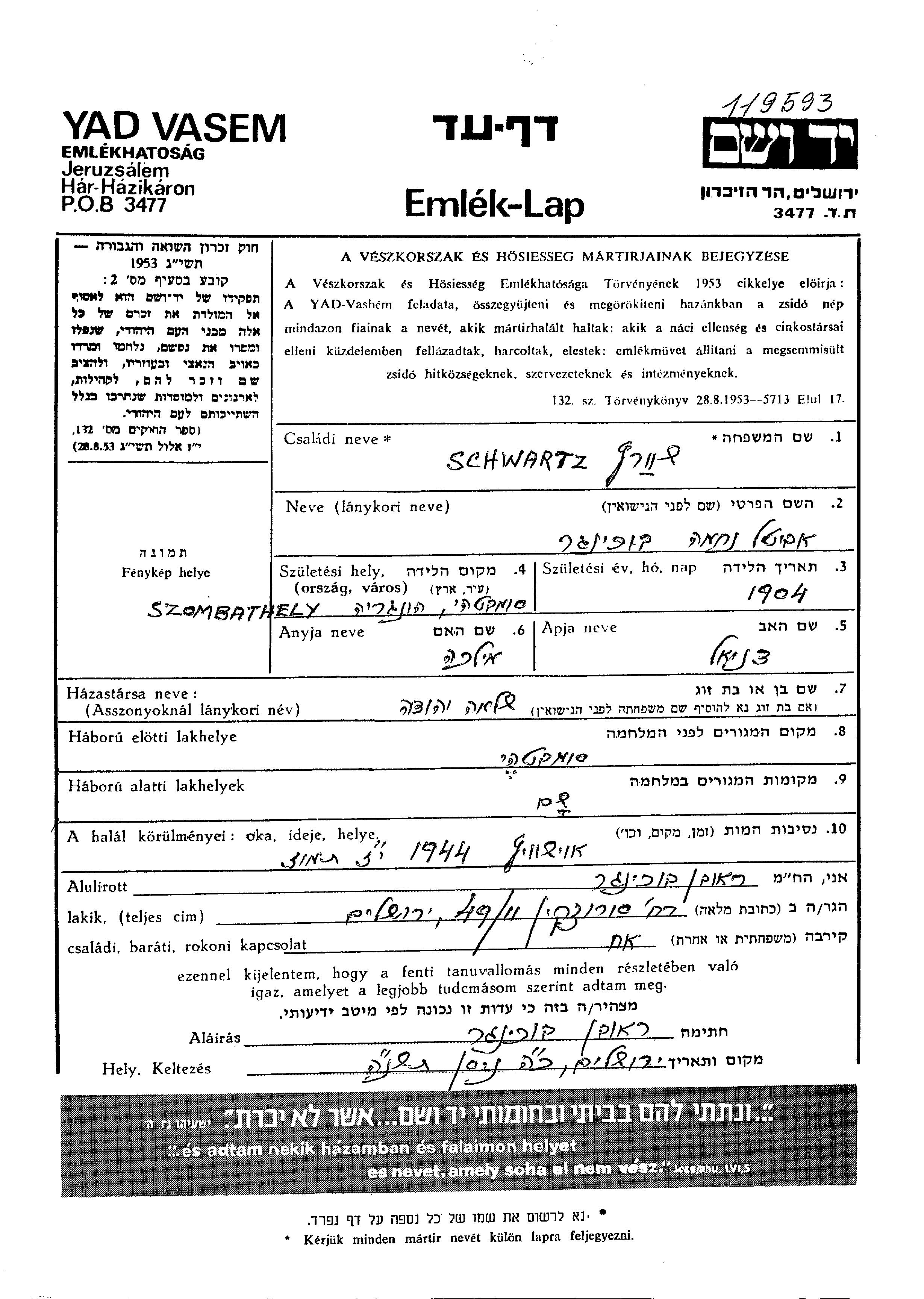 Schwartz Avital Nekhama 1904 Szombathely, Hongrie Feuille de témoignage