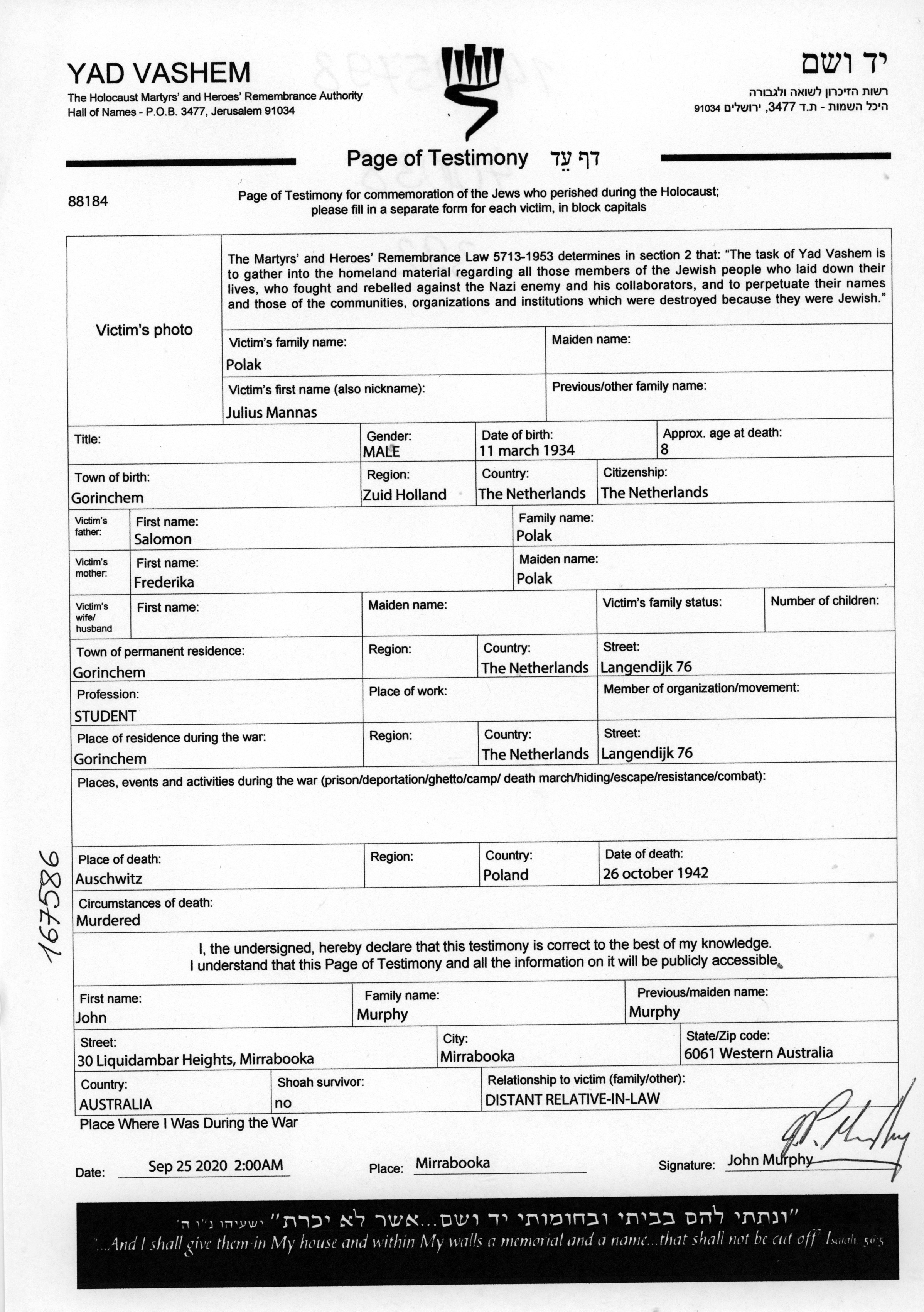 Julius Mannas Polak est né à Gorinchem, Pays-Bas en 1934. Il était Étudiant/e. Avant la seconde guerre mondiale il vivait à Gorinchem, Pays-Bas.