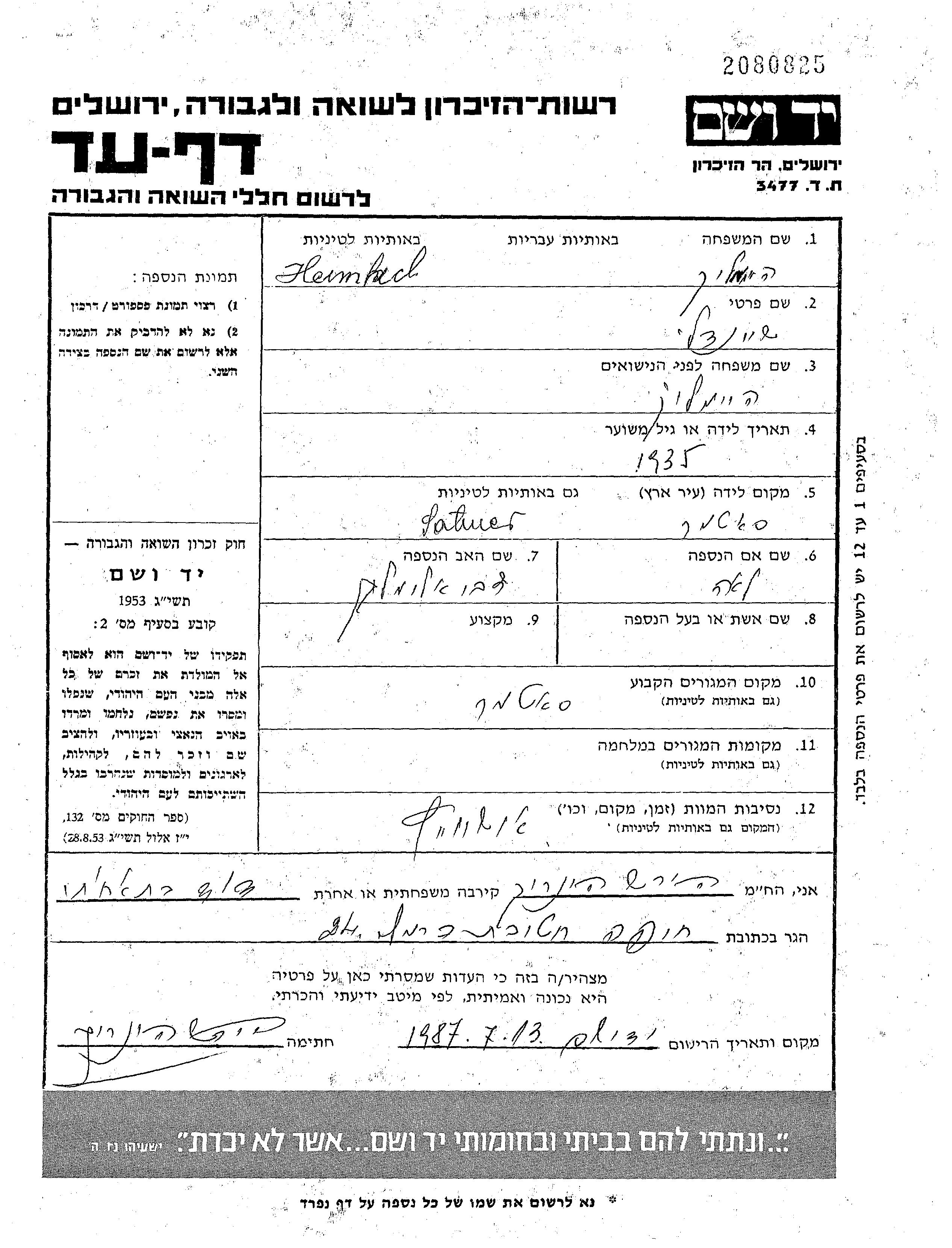 Heimlikh | Yafa Sheindla | 1935 | Sotmar, Roumanie | Feuille de témoignage |