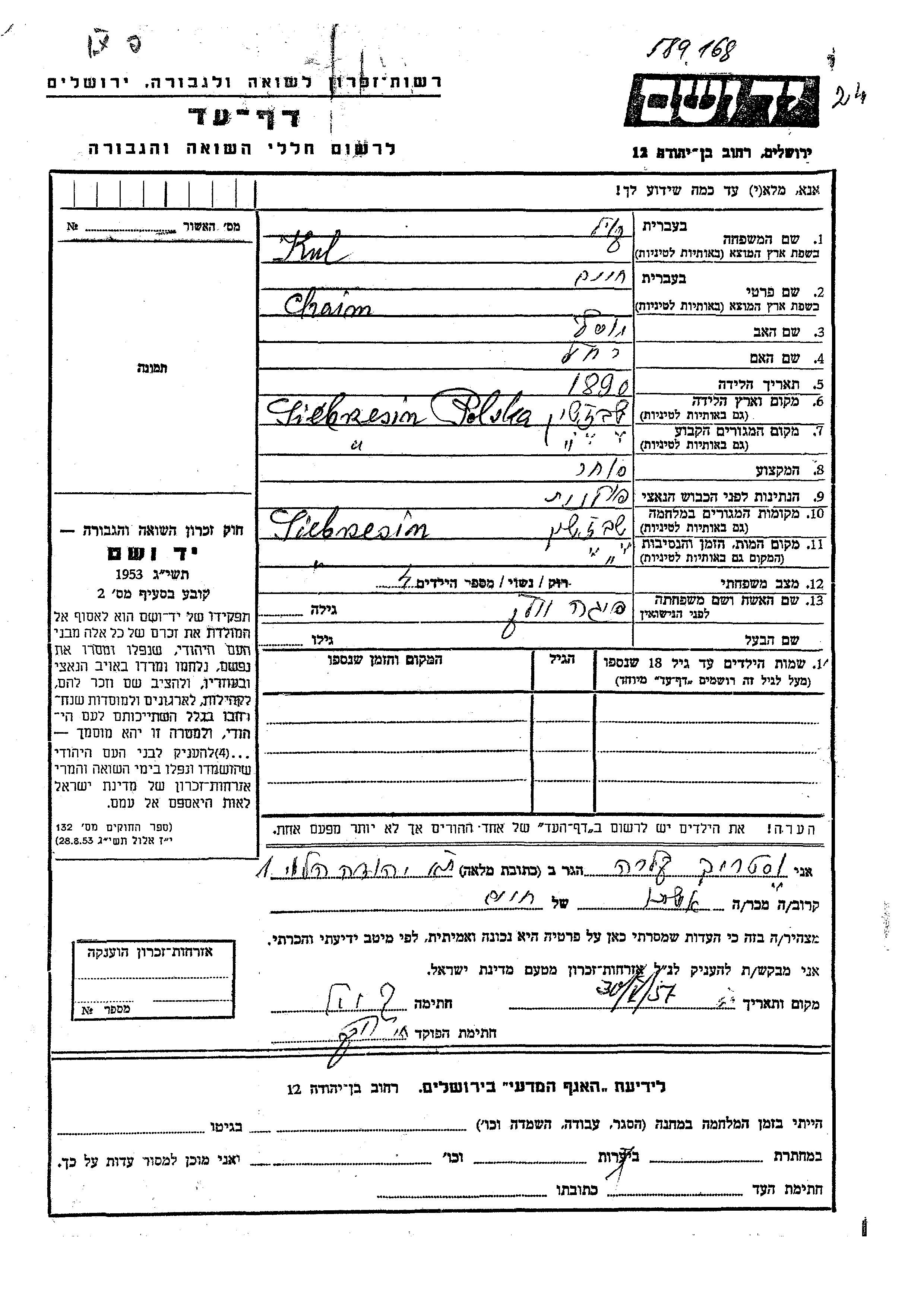 Kul Chaim 1890 Szczebrzeszyn, Pologne Feuille de témoignage
