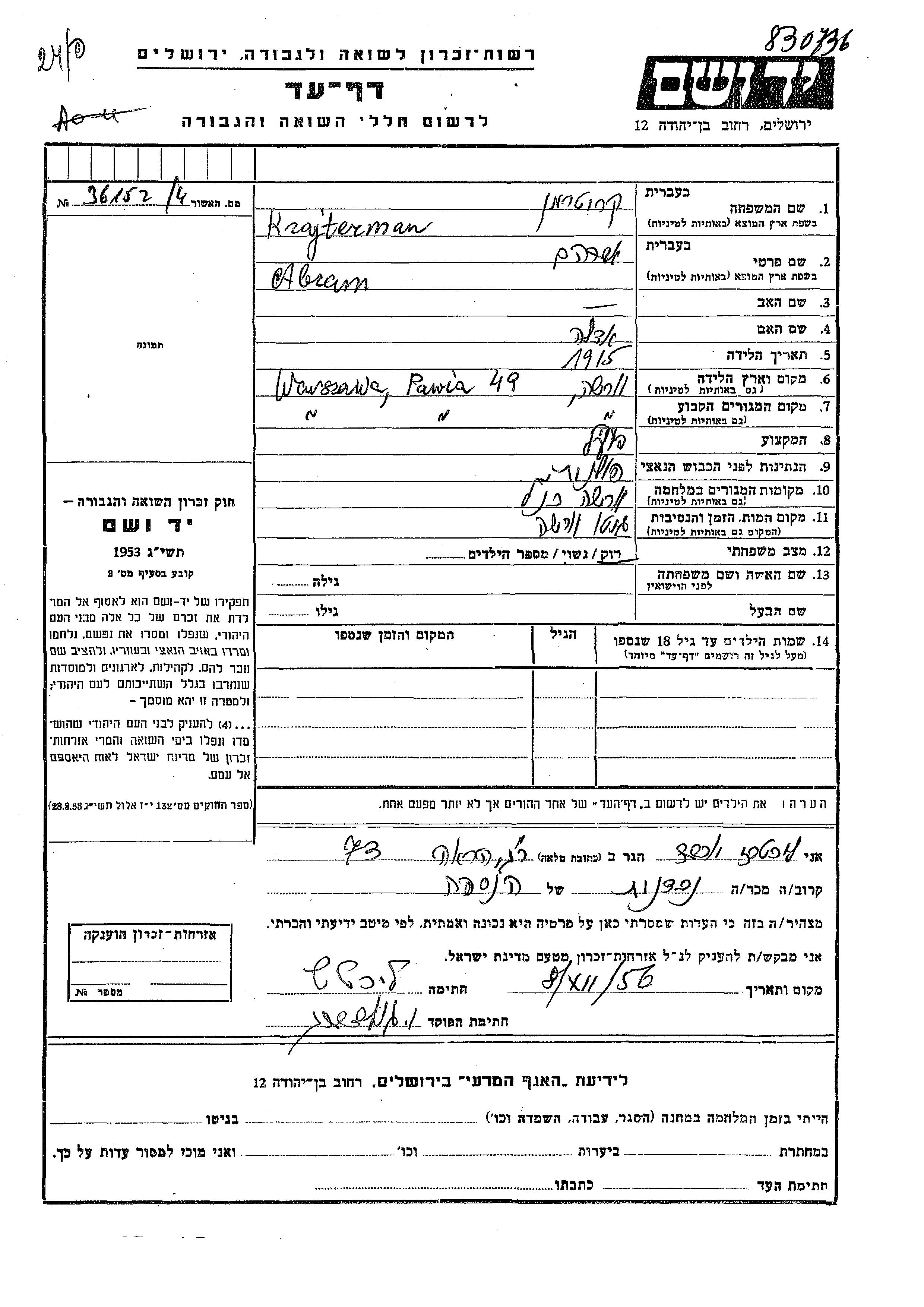 Krajterman Abram 1915 Warschau, Pologne Feuille de témoignage