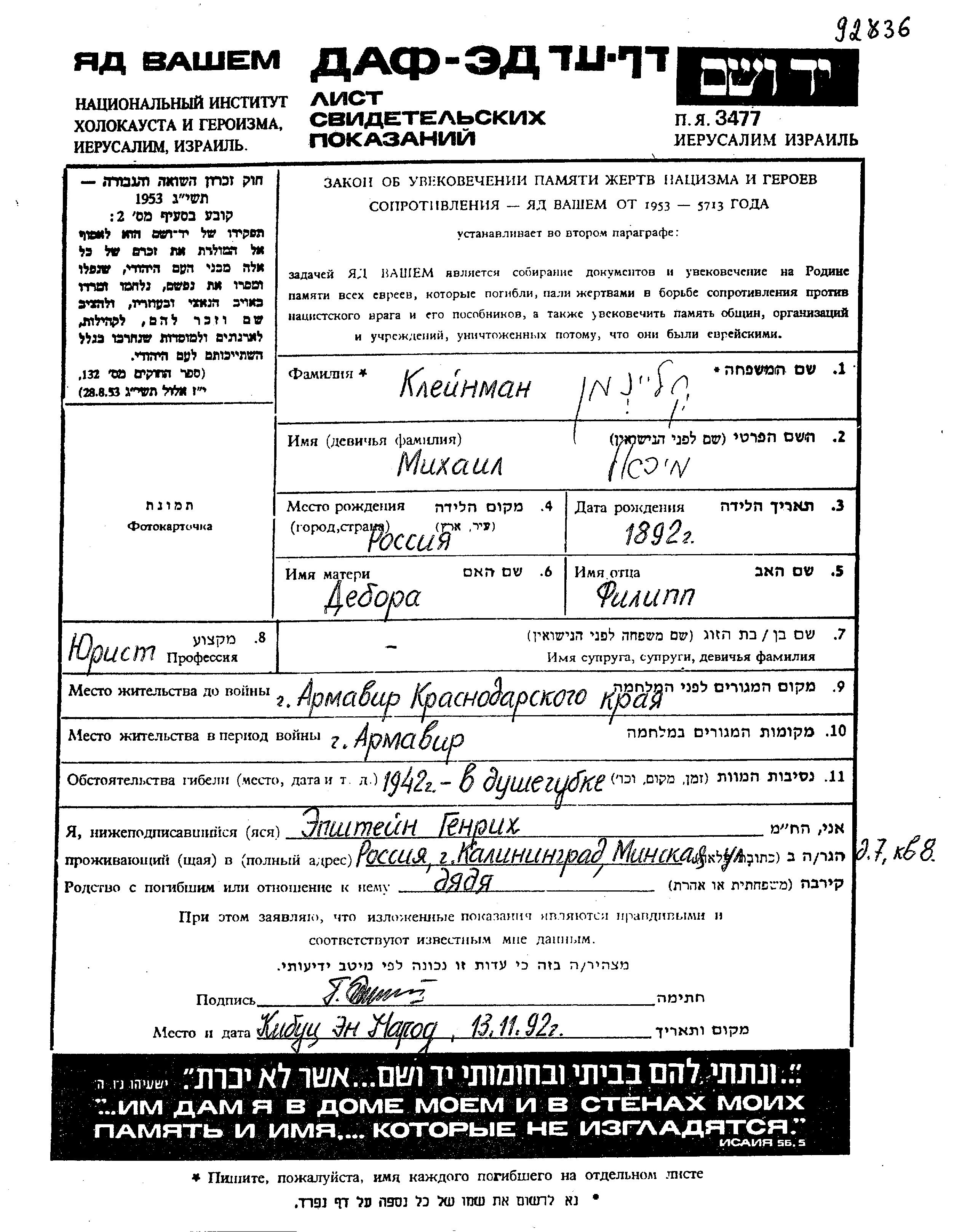 Kleynman Mikhail 1892 Armavir, Russie (URSS) Feuille de témoignage