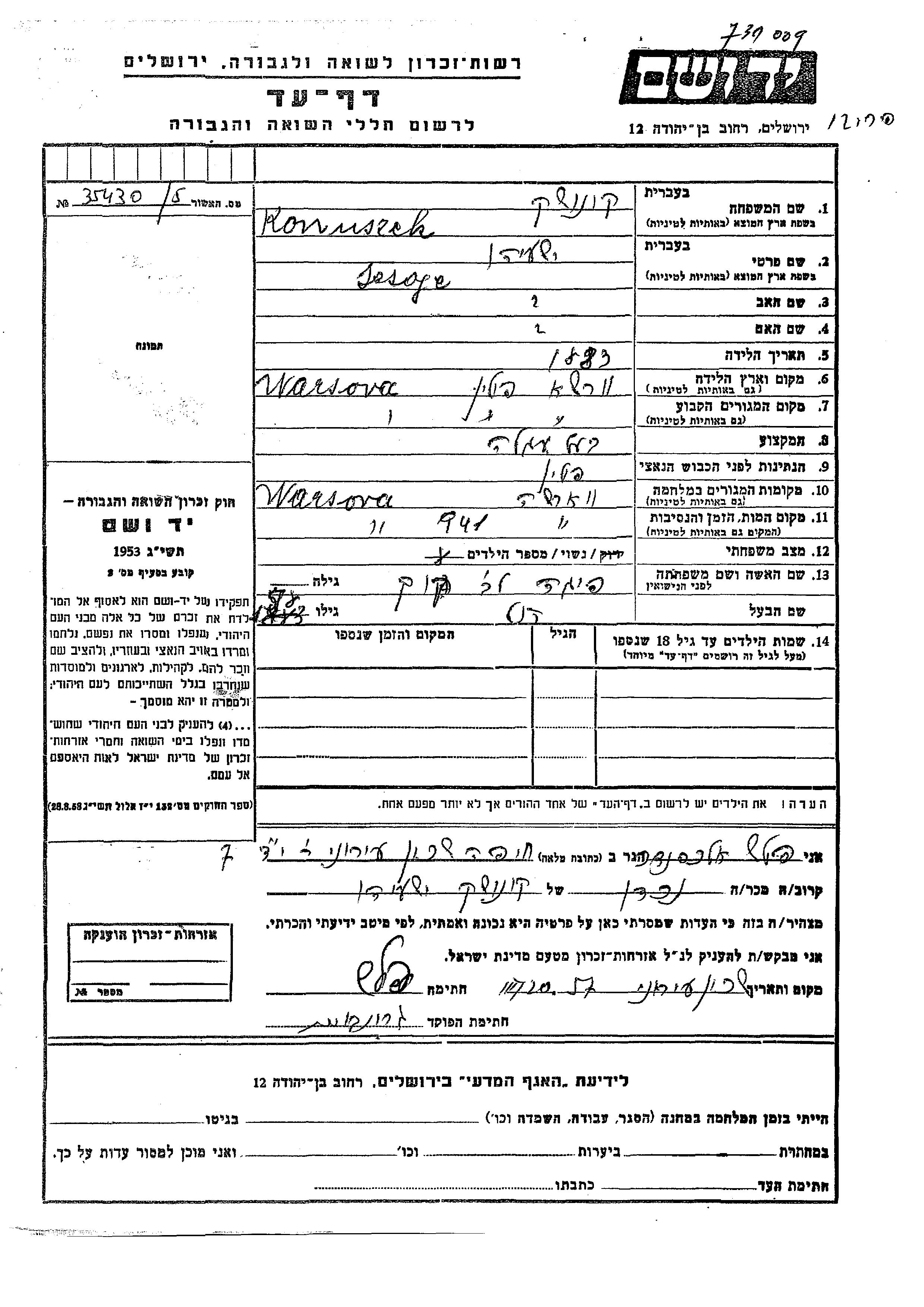 Jesoye Konuszek est né à Warsaw, Pologne en 1883. Il était Charretier et Mariée à Feiga née Kok. Avant la seconde guerre mondiale il vivait à Warsaw, Pologne. Au cours de la guerre, il était à Warsaw, Pologne.