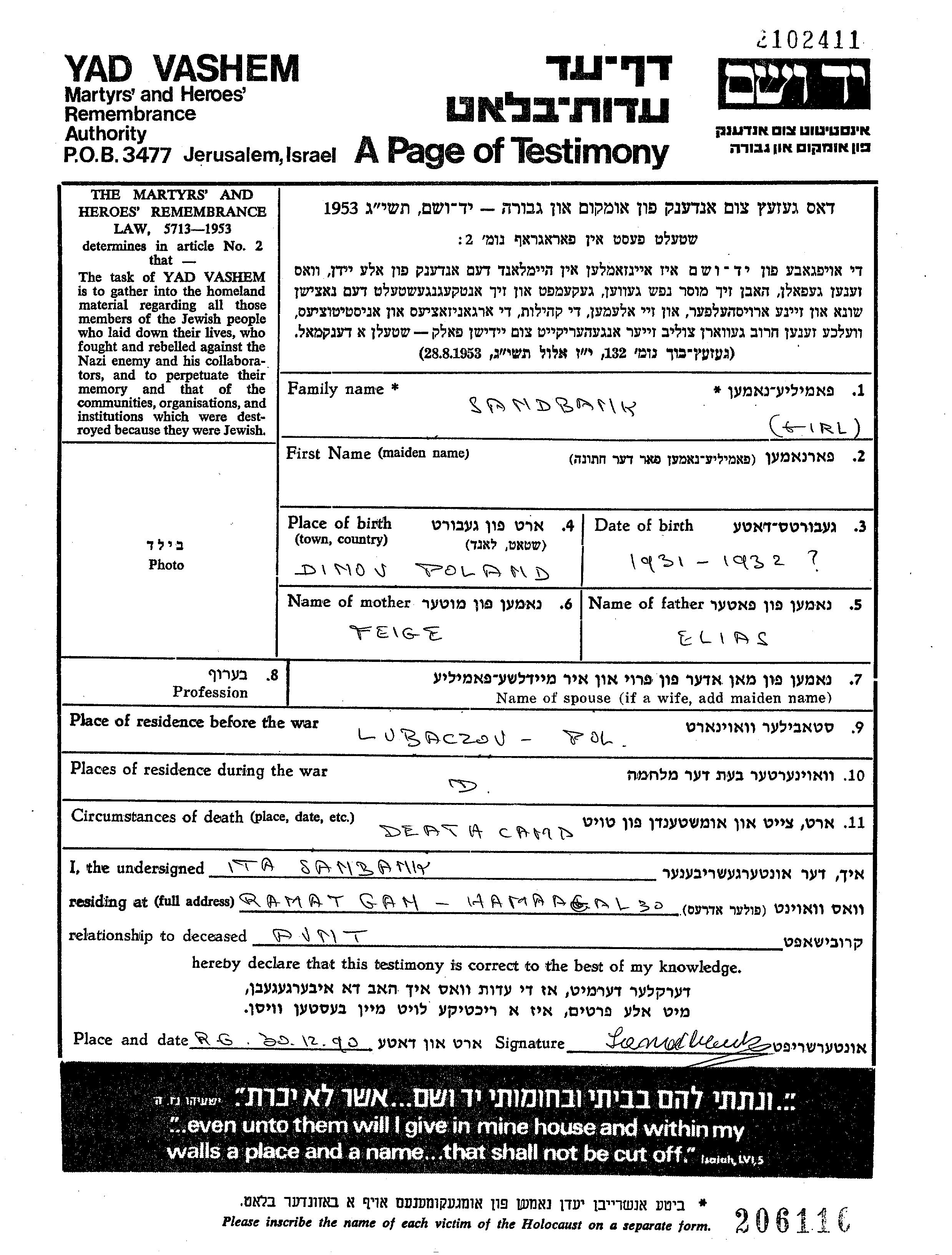 Sandbank prénom inconnu Lubaczow, Pologne Feuille de témoignage