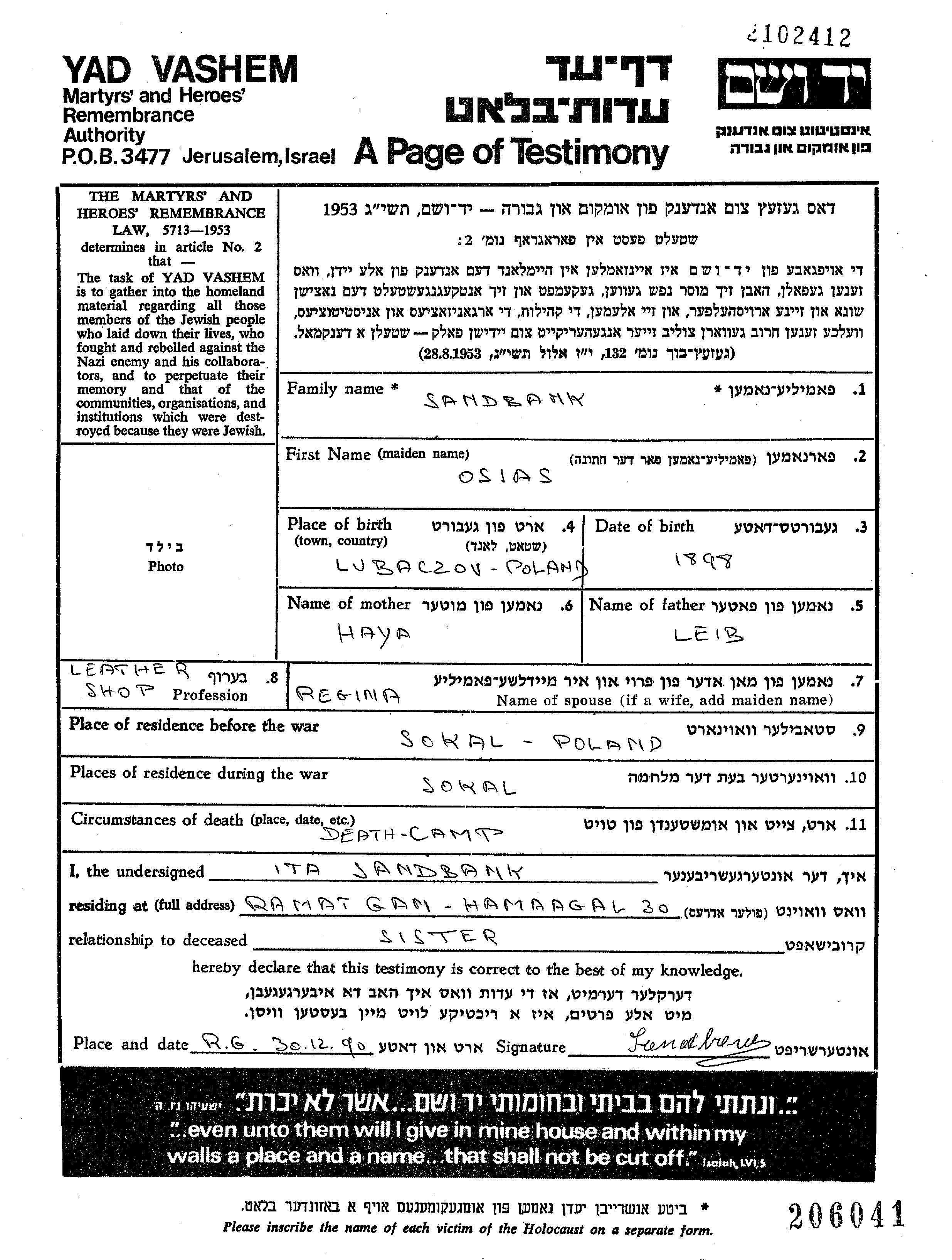 Osias Hoshea Sandbank est né à Lubaczow, Pologne, fils de Leib et de Haya née Riss. Il était Propriétaire d'un magasin et Mariée à Regina. Avant la seconde guerre mondiale il vivait à Sokal, Pologne. Au cours de la guerre, il était à Sokal, Pologne.