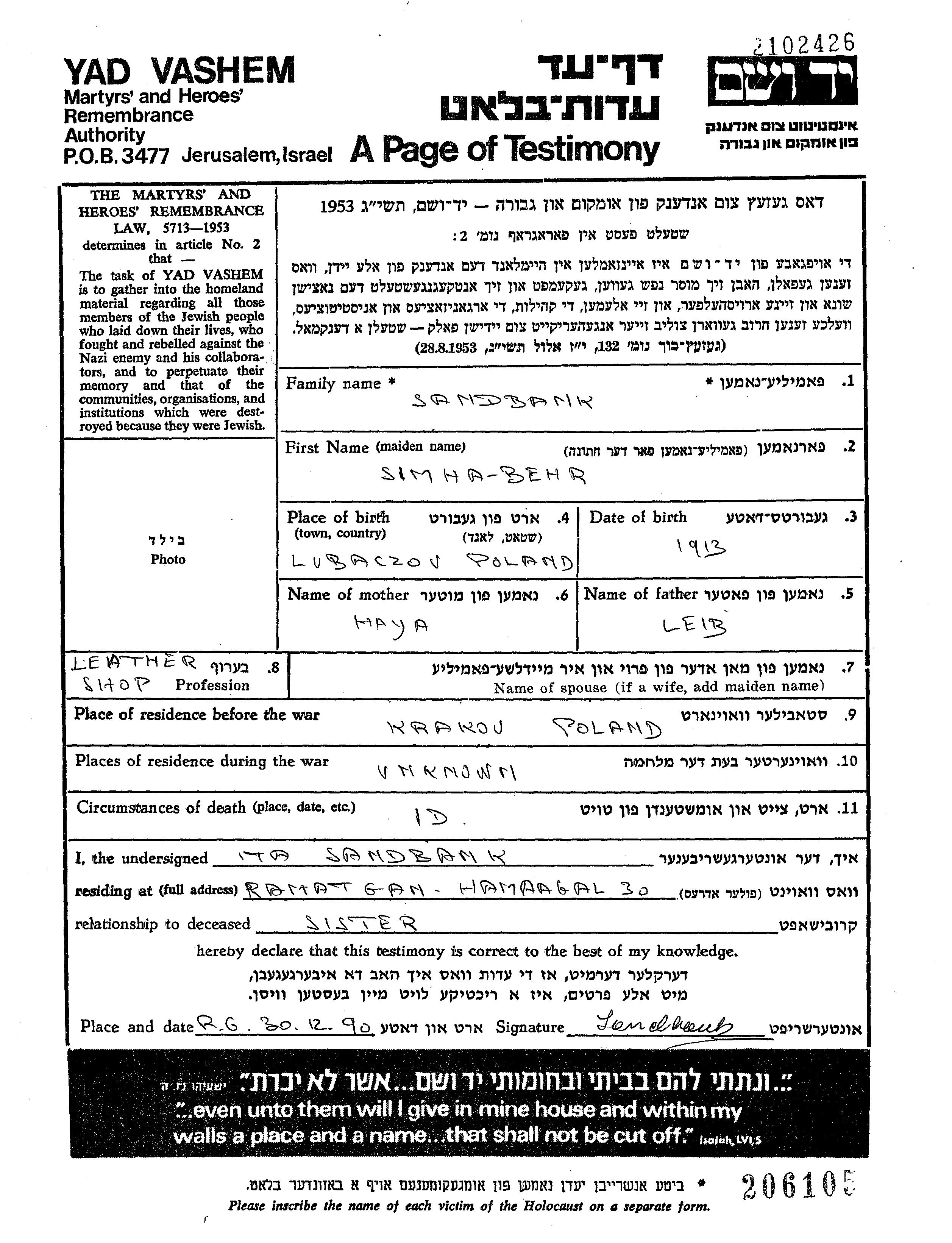 Simha Behr Sandbank est né à Lubaczow, Pologne, fils de Leib et de Haya née Riss. Il était Propriétaire d'un magasin. Avant la seconde guerre mondiale il vivait à Krakow, Pologne.