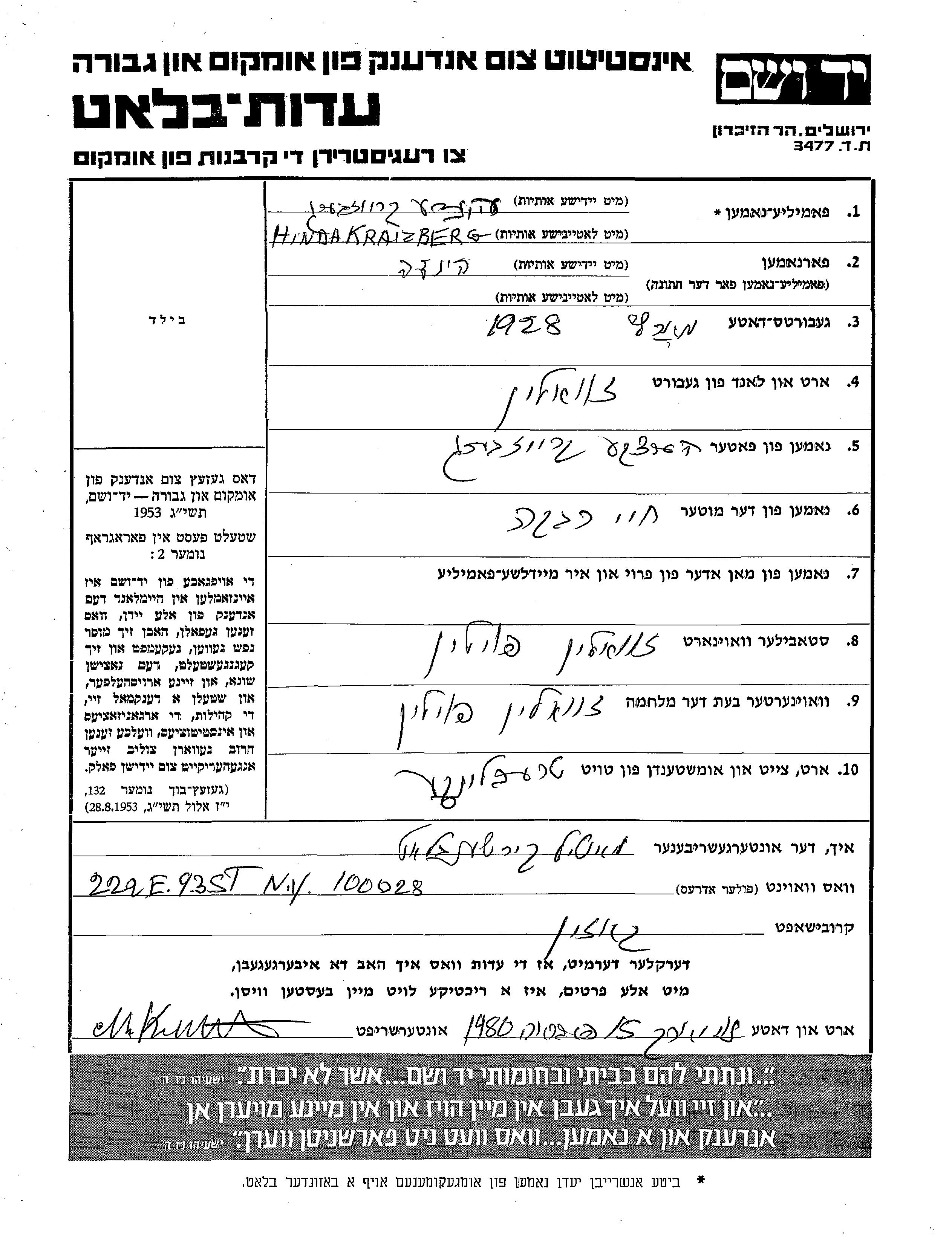 Kraizberg Kreinberg Hinda 1928 endroit inconnu, Feuille de témoignage