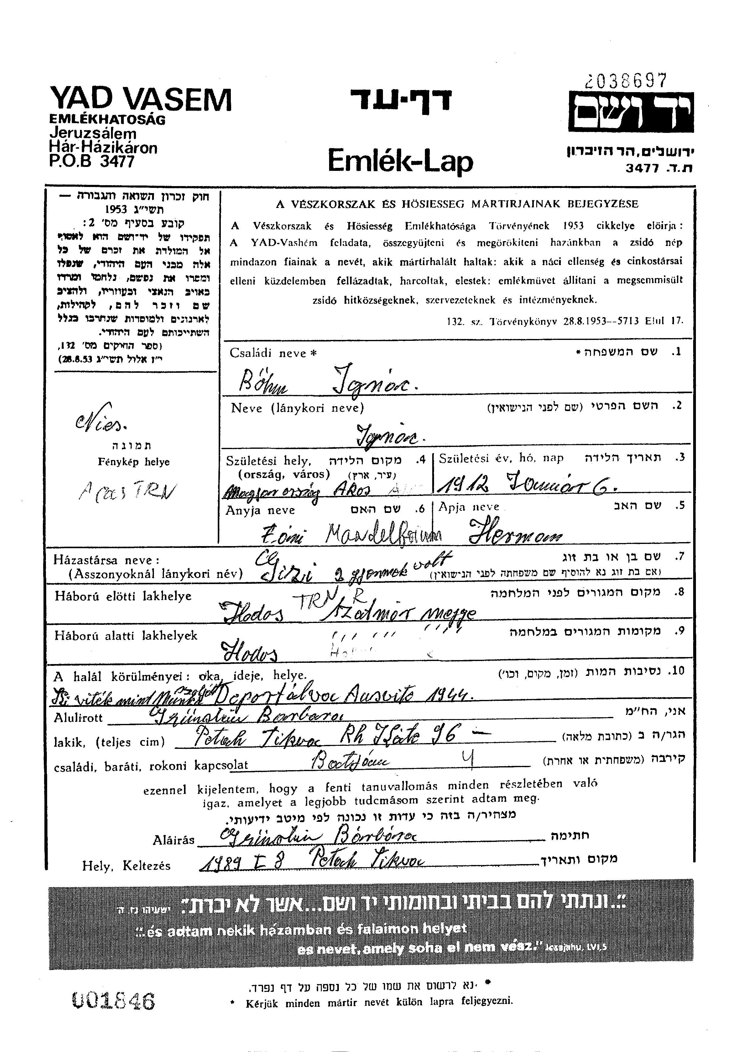 Ignac Bohm est né à Akos, Roumanie en 1911. Il était Commerçant/e. Avant la seconde guerre mondiale il vivait à Hodos, Roumanie.