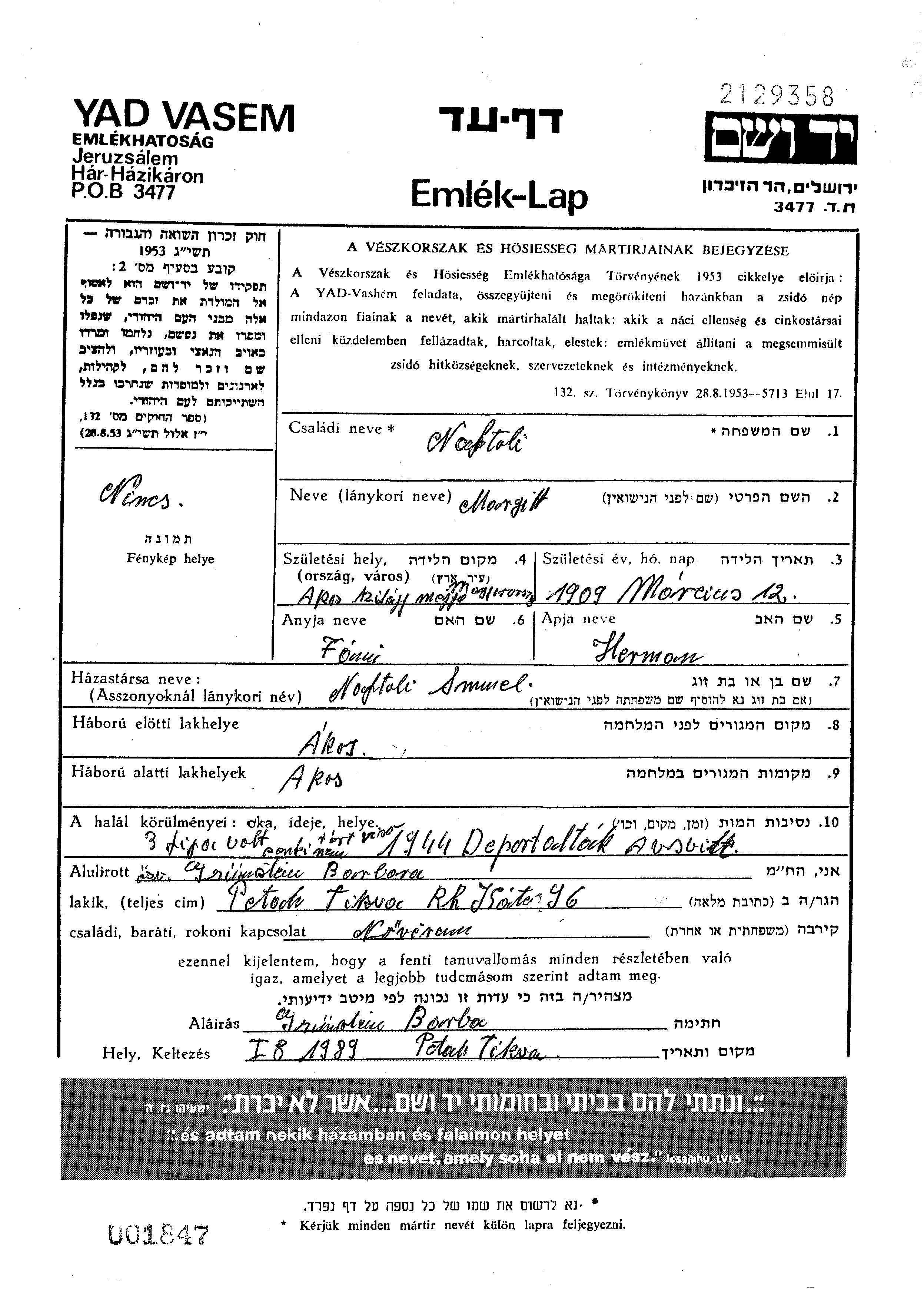 Naftoli | Margit | 1910 | Akos, Roumanie | Feuille de témoignage |