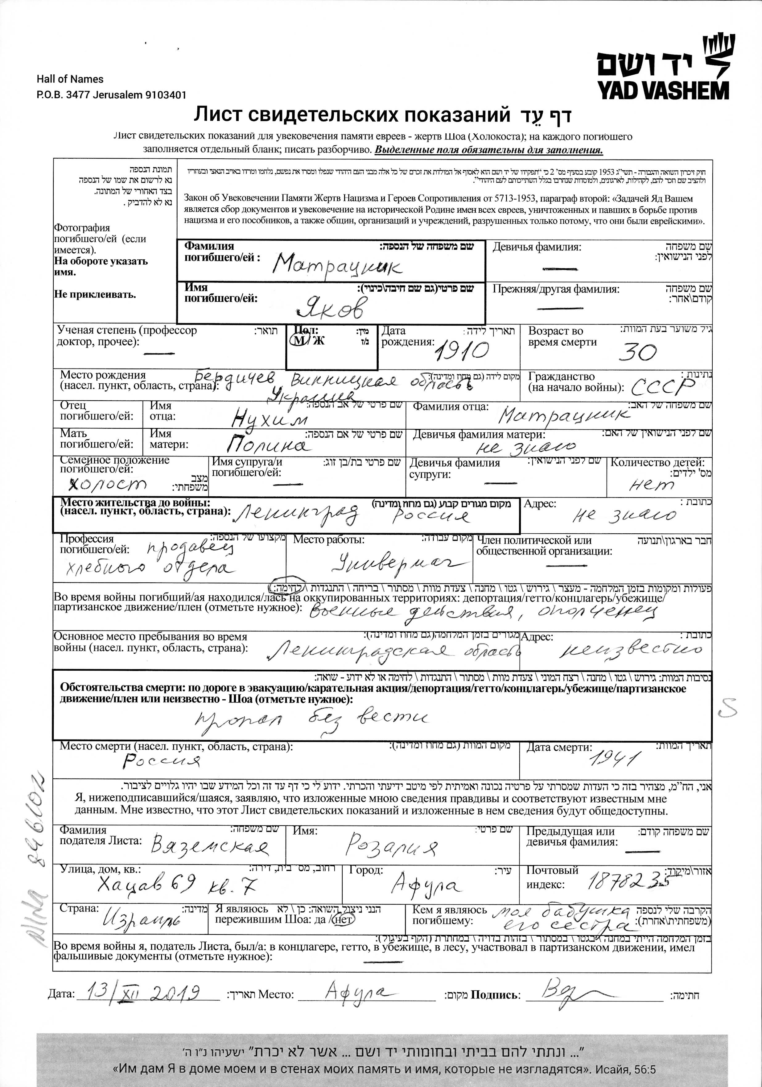 Matratznik Yakov 1912 Leningrad, Russie (URSS) Feuille de témoignage