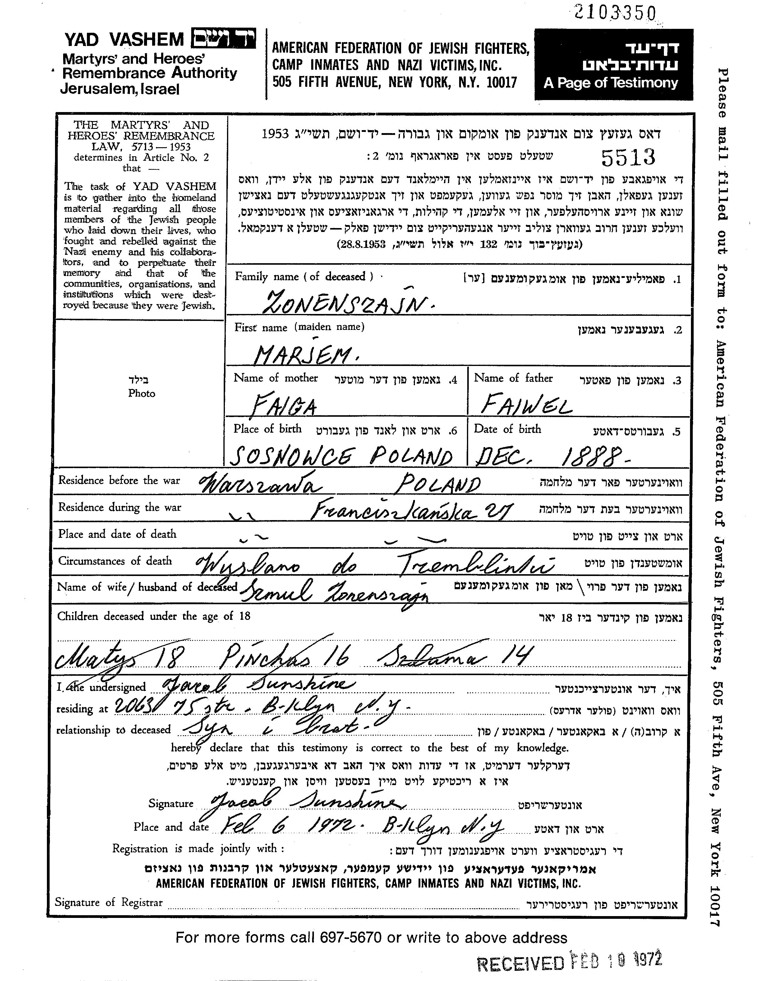 Zonenszajn Marjem Warszawa, Pologne Feuille de témoignage