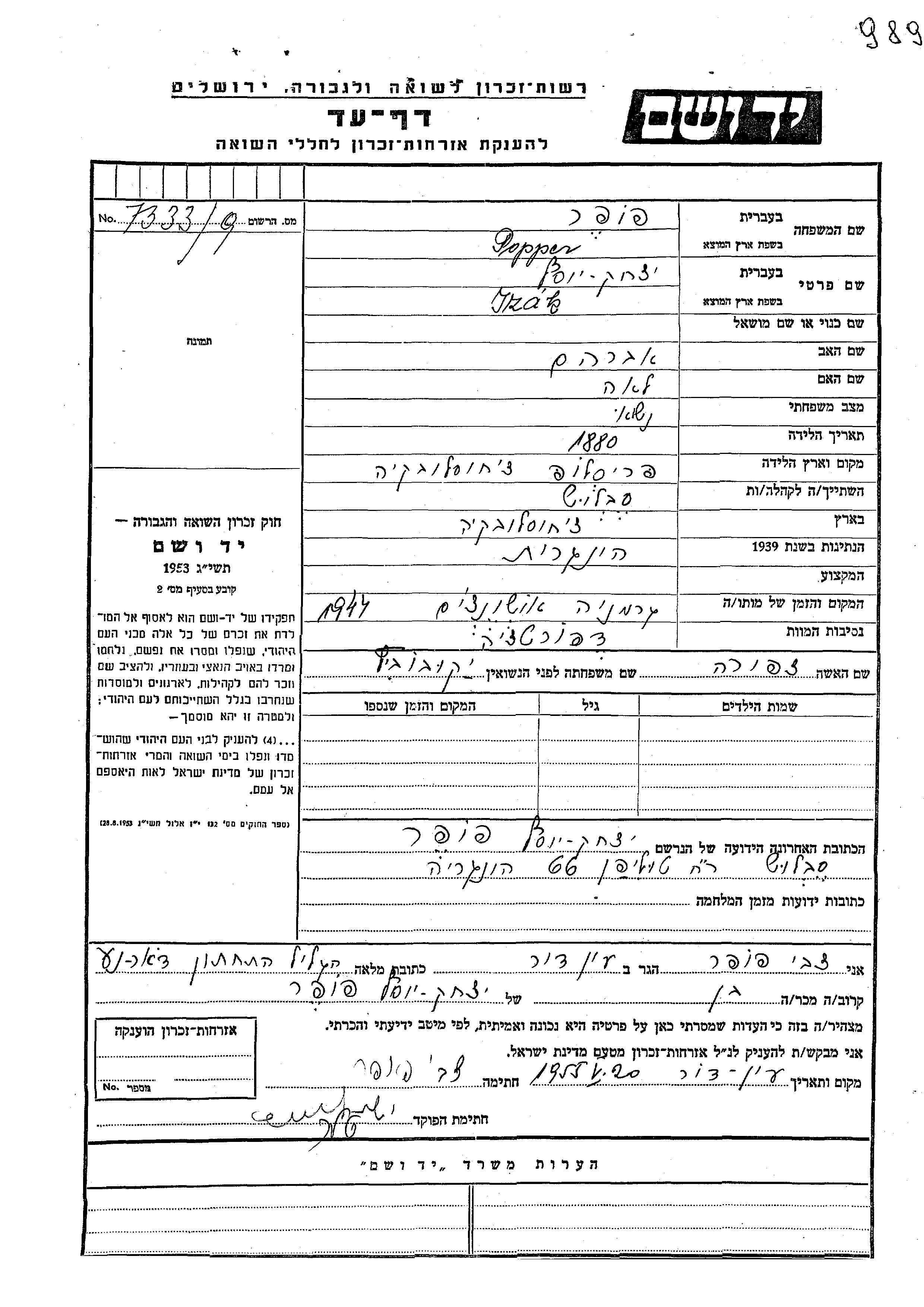 Poper Icchak 1883 Szolos, Tchécoslovaquie Feuille de témoignage