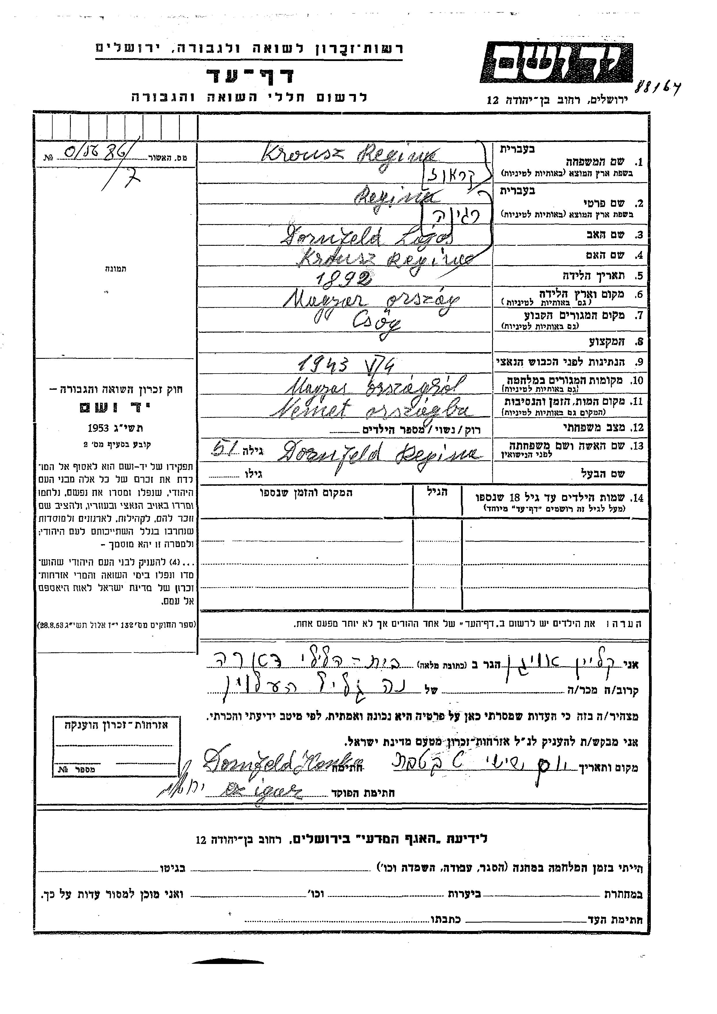 Regina Krousz née Dornfeld est née à Hongrie en 1892, fille de Lajos et de Regine. Elle était Célibataire. Avant la seconde guerre mondiale elle vivait à Csog, Roumanie. Pendant la guerre, elle était à Hongrie.