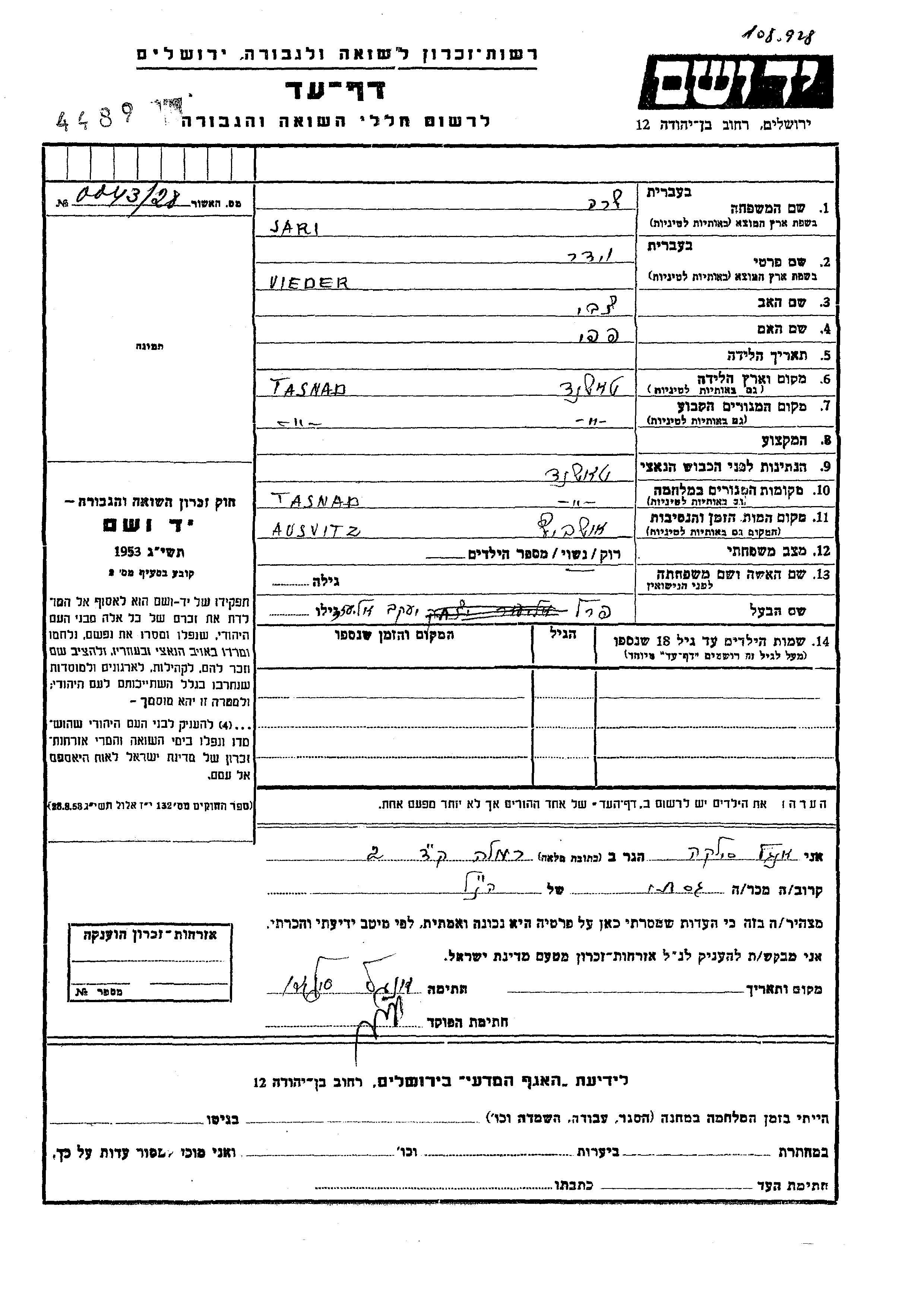Yad Vashem - Pages of Testimony Names Memorial Collection