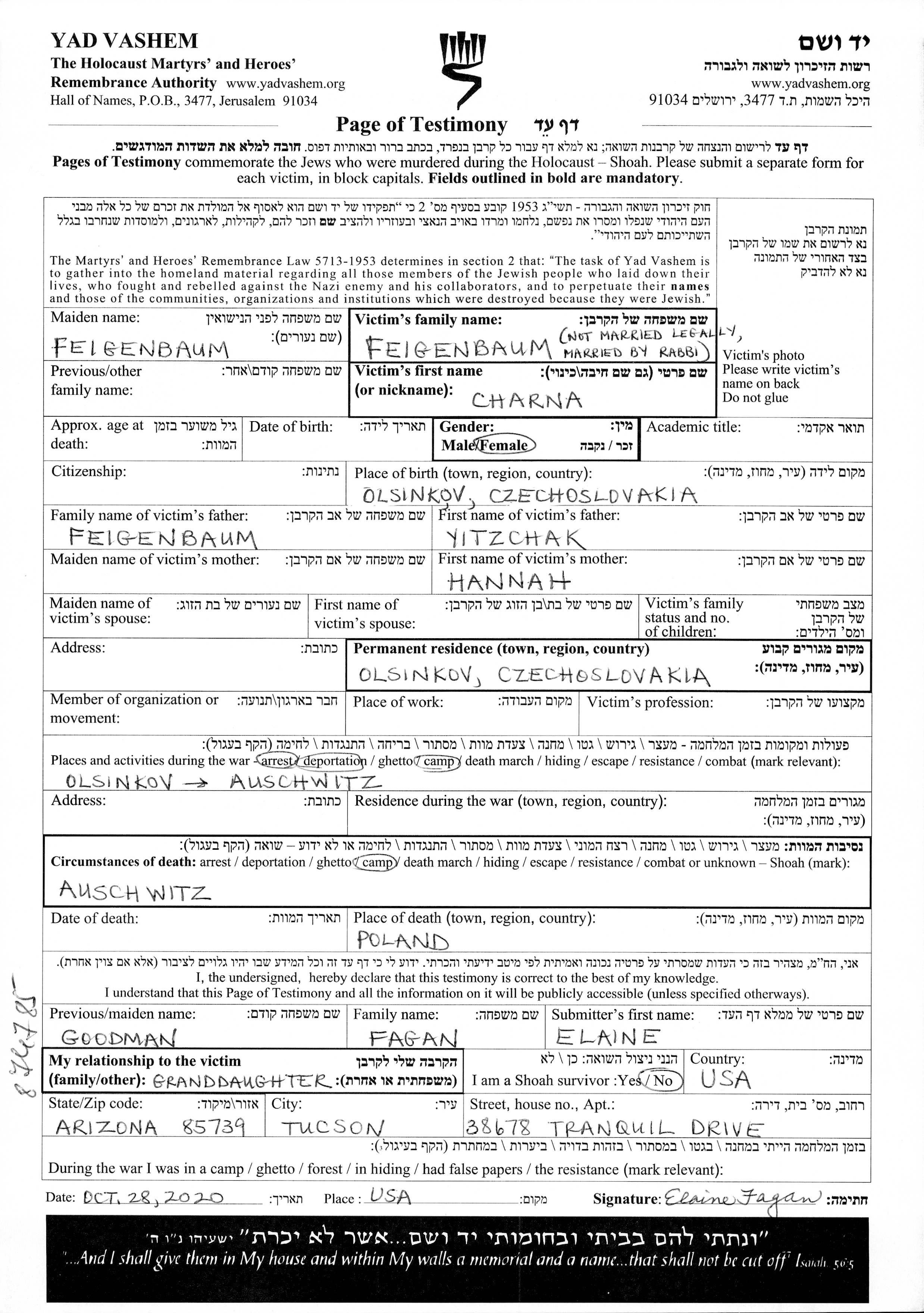 Charna Feigenbaum est née à Oľšinkov, Tchécoslovaquie, fille de Yitzchak et de Hannah. Avant la seconde guerre mondiale elle vivait à Oľšinkov, Tchécoslovaquie. Pendant la guerre, elle était à Auschwitz, Pologne.